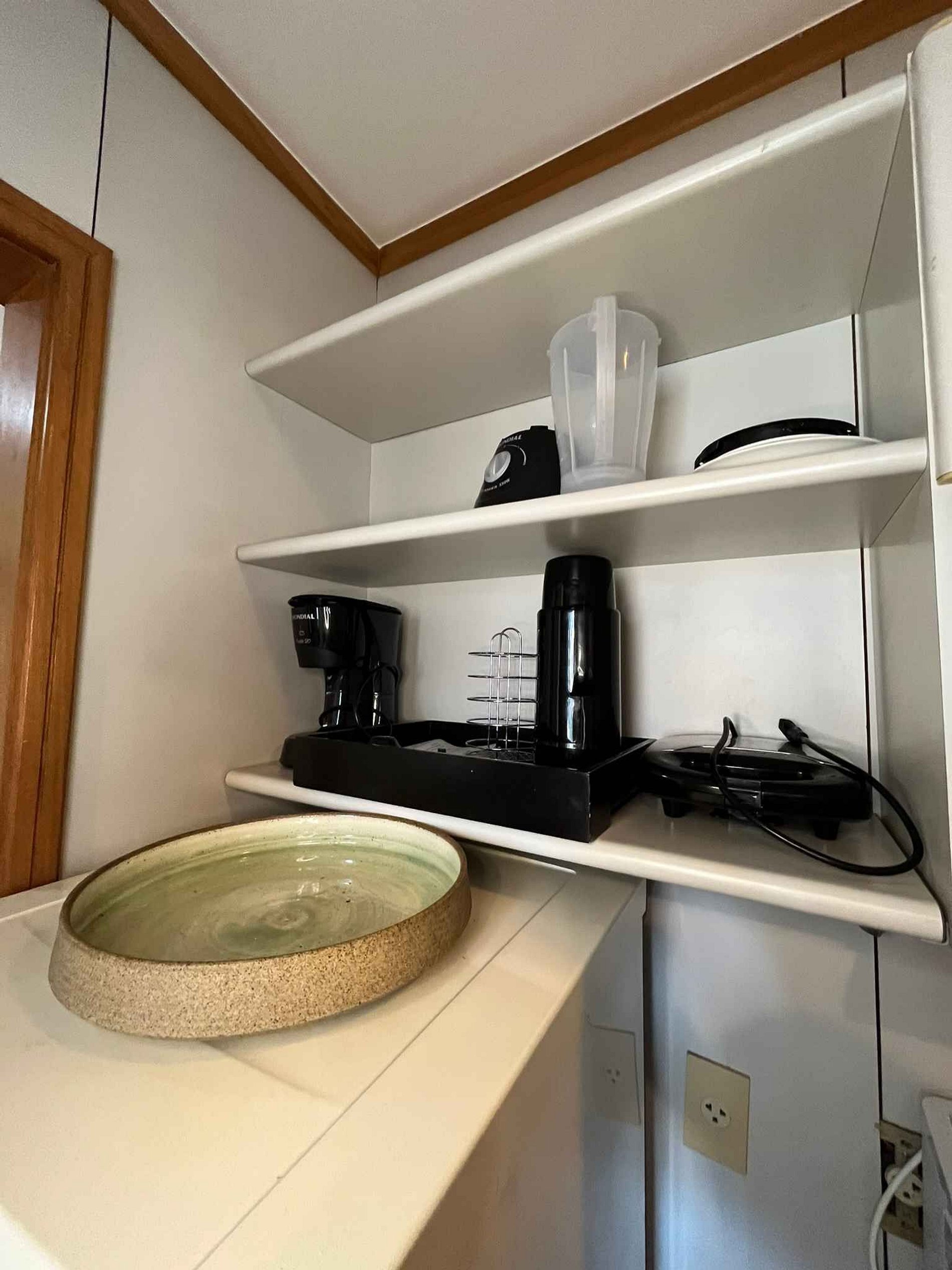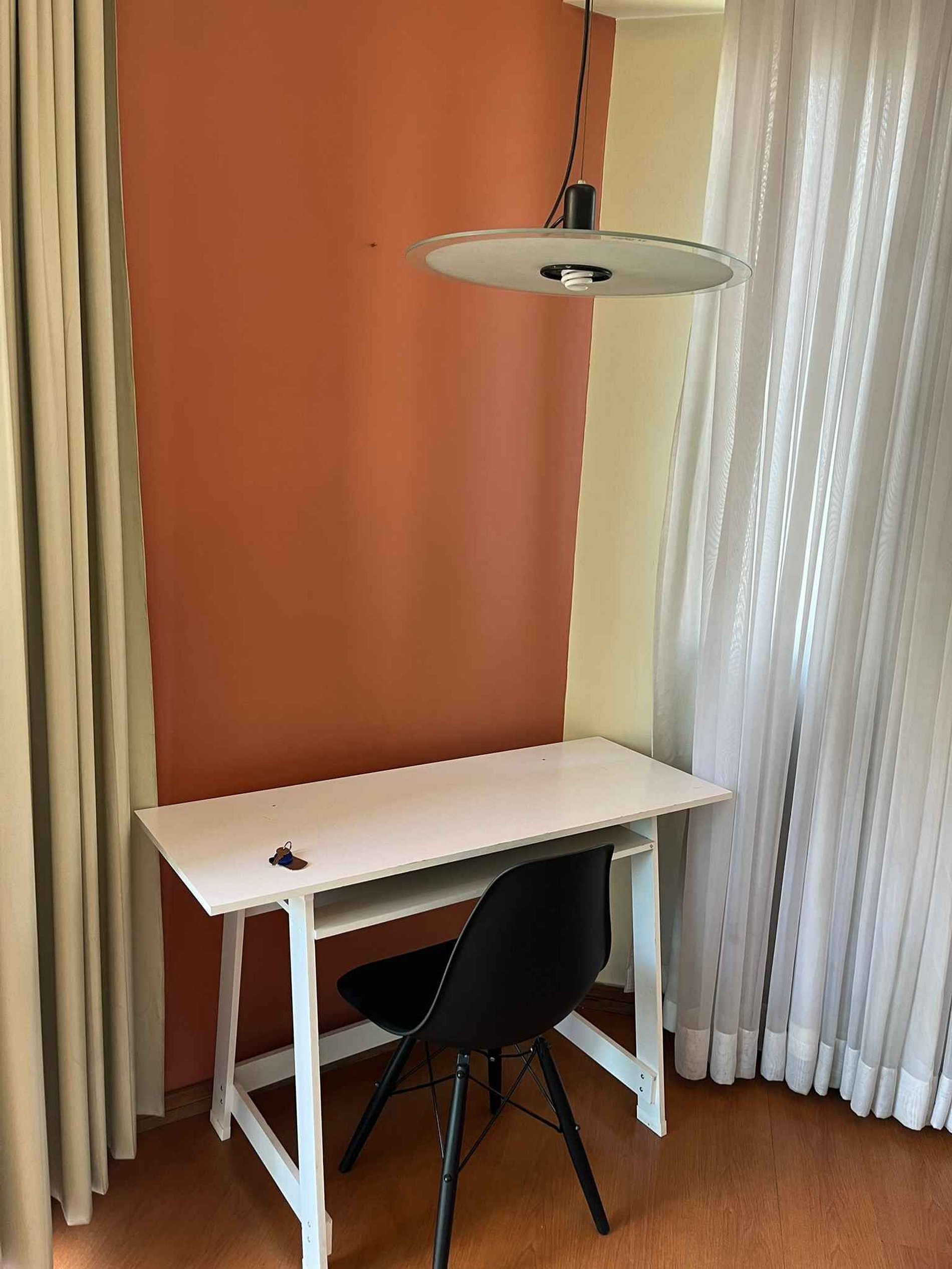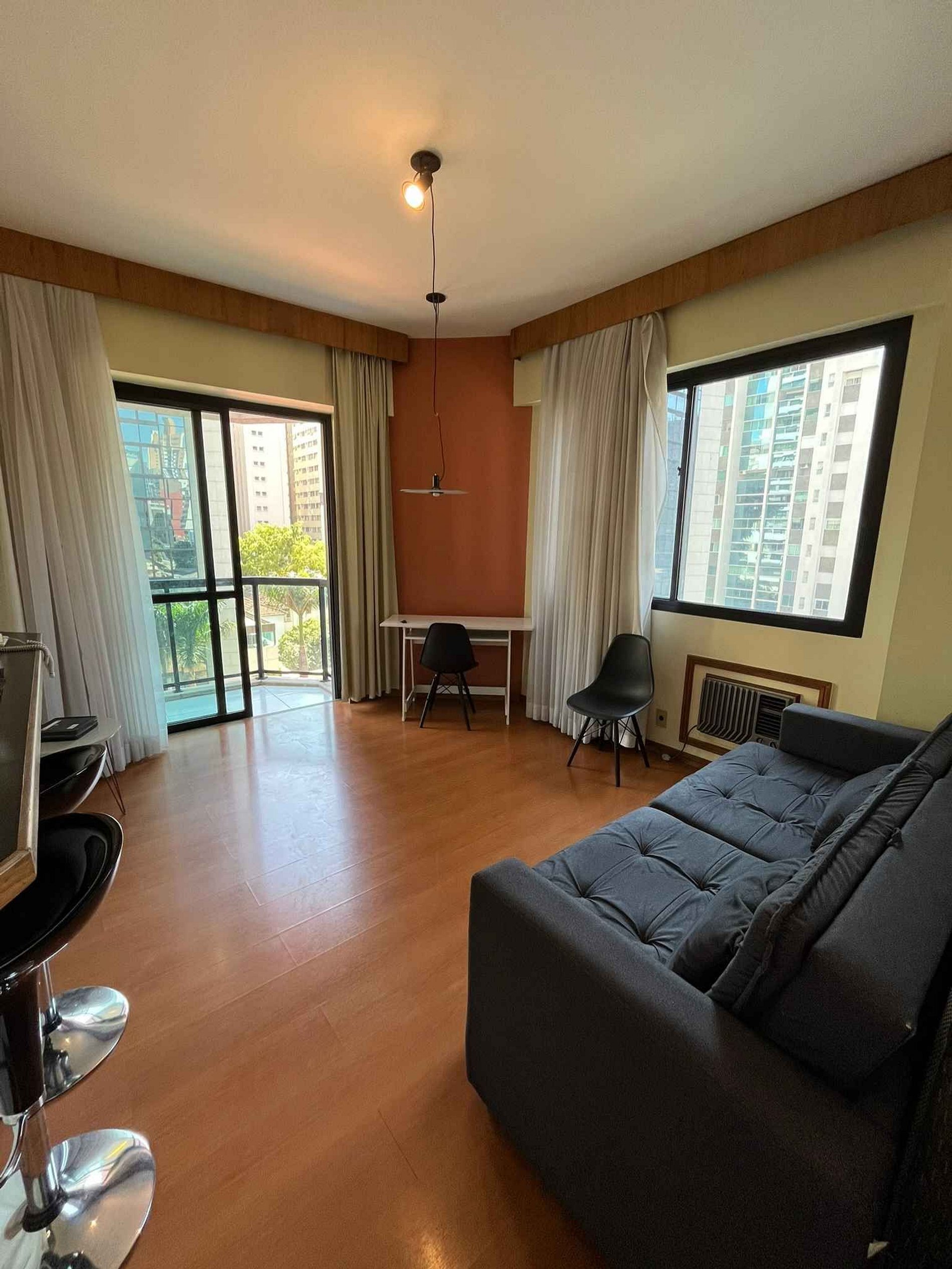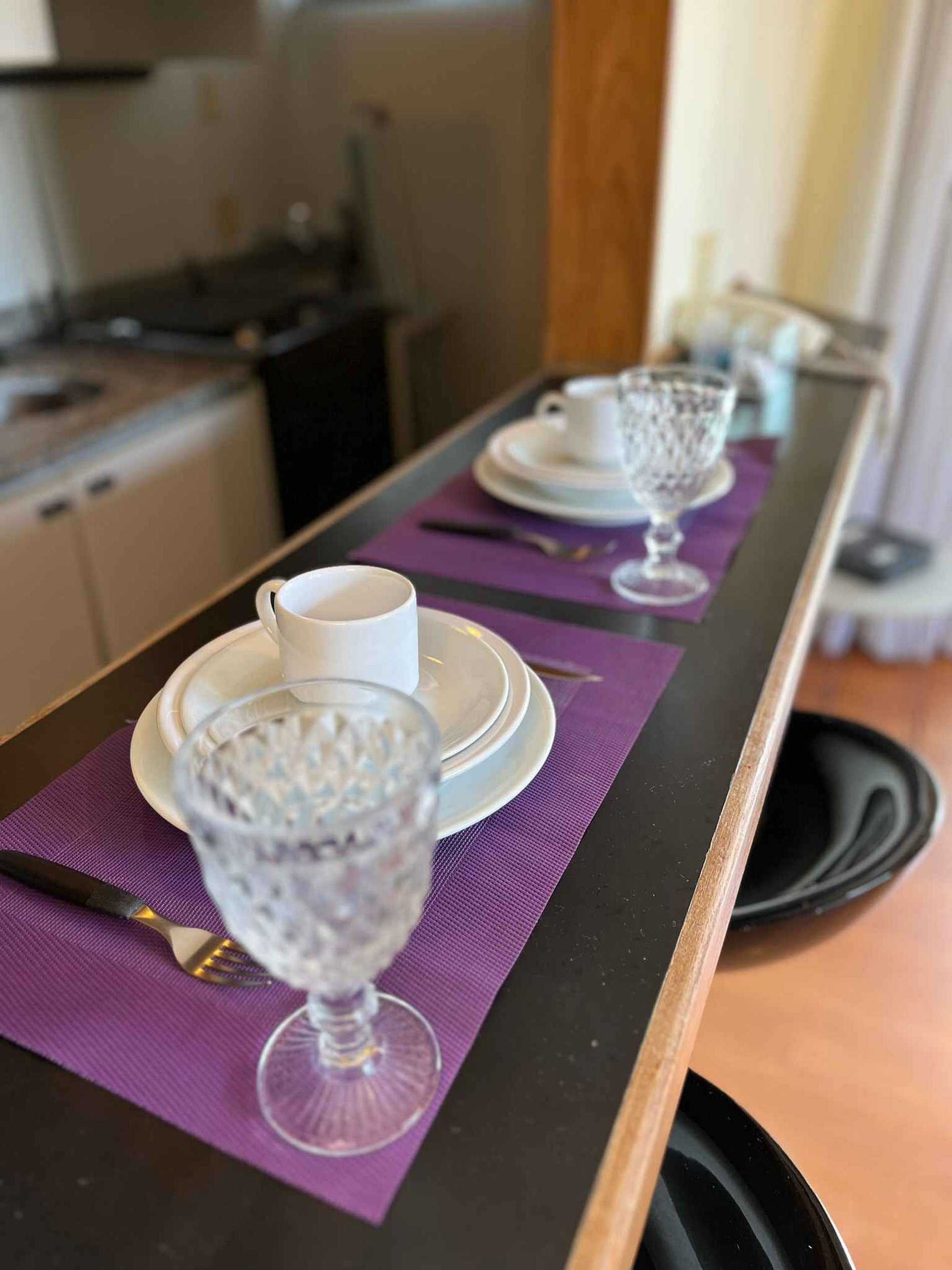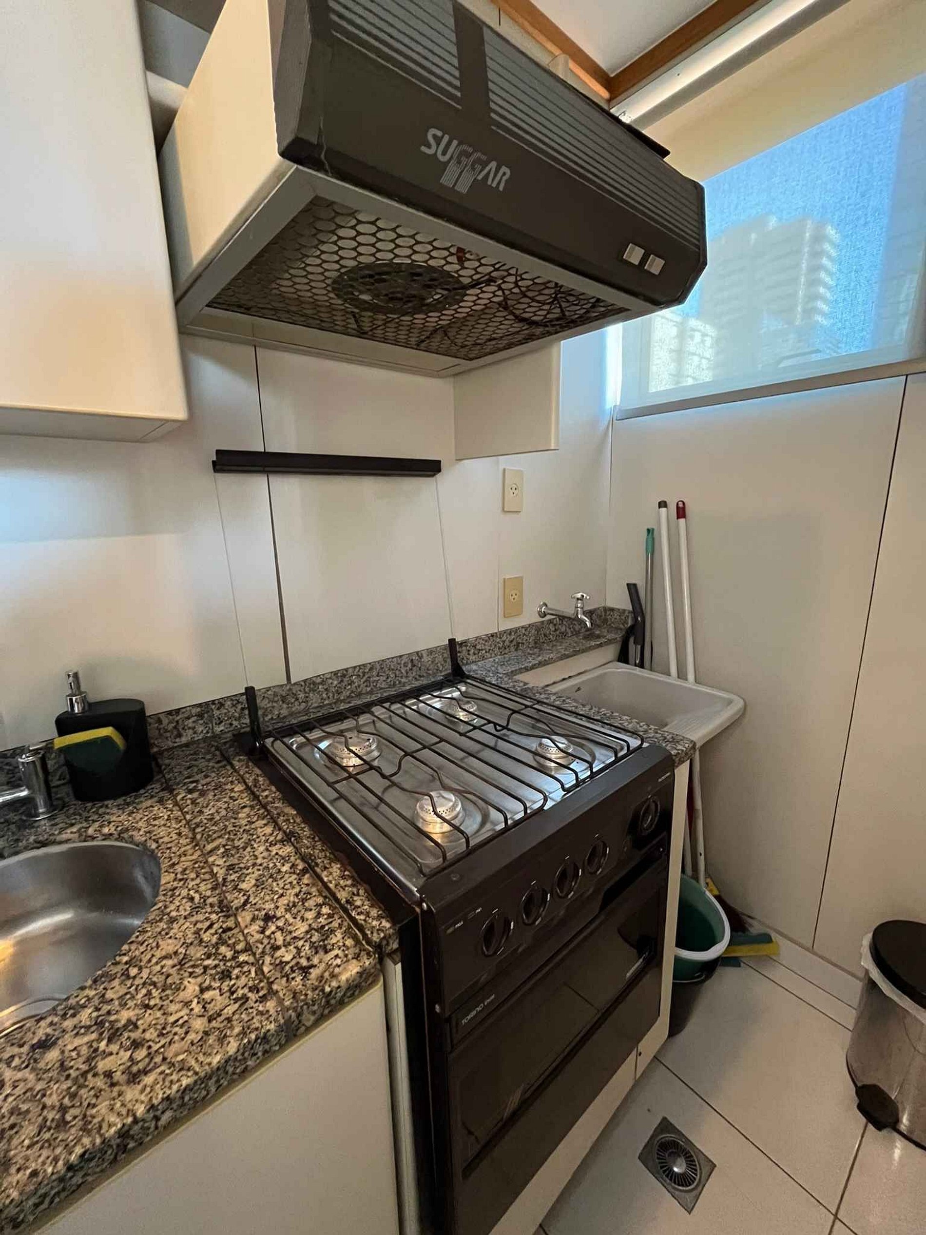 O quarto possui uma cama de casal padrão, um criado e armário com cabides e televisão. O apartamento oferece travesseiros, roupa de cama e banho, shampoo e sabonete. A sala de estar possui um ambiente com uma uma bancada com duas cadeiras para refeição e trabalho e um sofá com televisão 43". O outro ambiente é uma cozinha americana com armários, e está equipada com refrigerador fogão quatro bocas com forno, Micro-ondas de 20L, sanduicheira inox grill, liquidificador, garrafa térmica com base de filtro para café e cafeteira elétrica. A cozinha possui também copos, taças, pratos rasos, pratos fundos, tigelas e talheres e xícaras para quatro pessoas. Esta disponível ferro e taboa de passar.