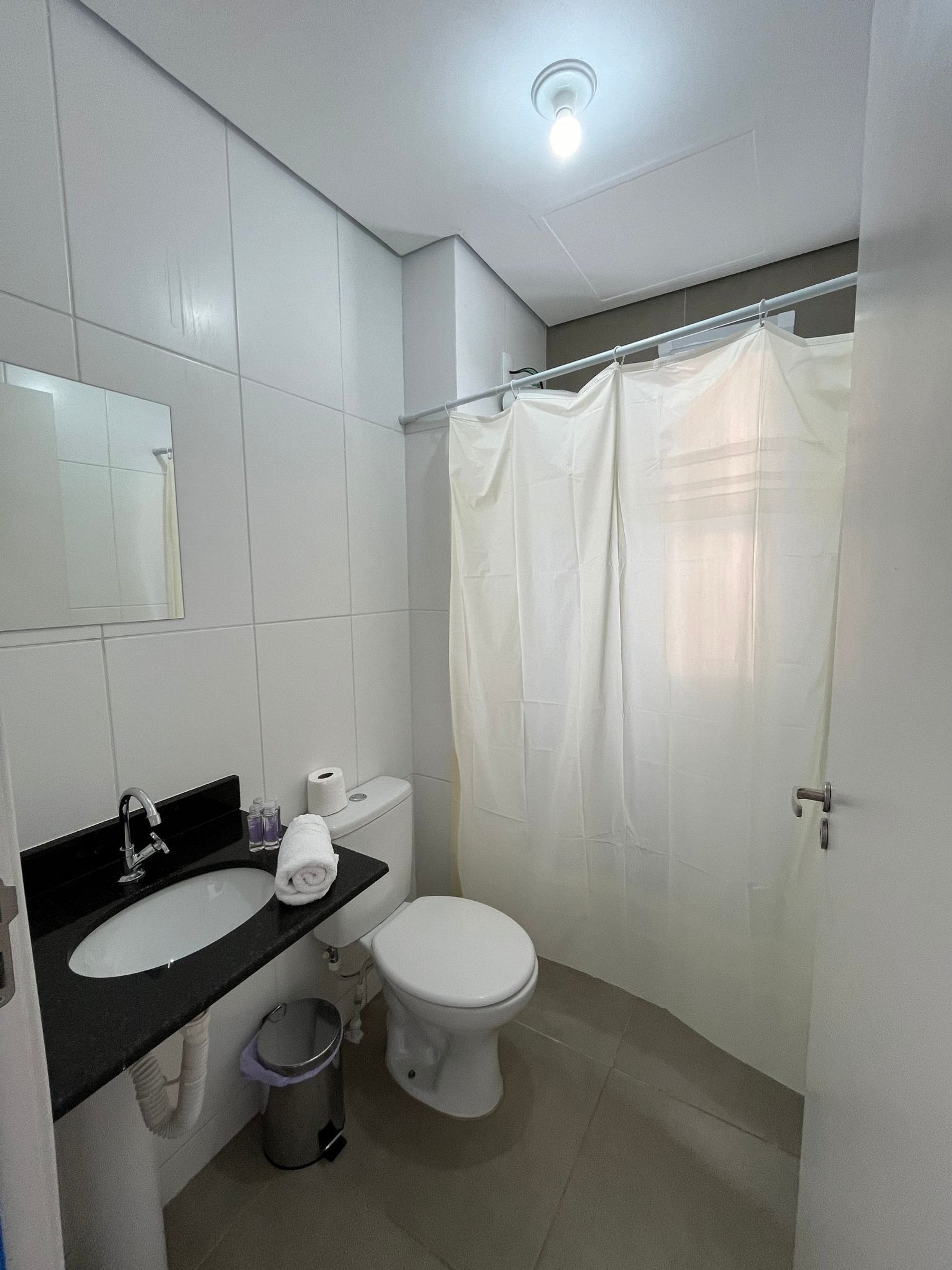 A suíte possui uma cama de casal, varanda, uma mesa de cabeceira e aramados com cabides. O segundo quarto conta com duas camas de solteiro. O apartamento oferece travesseiros, roupa de cama e banho, shampoo e sabonete. A sala de estar possui 02 ambientes, sendo um ambiente com uma uma mesa com quatro cadeiras para refeição e trabalho e um sofá com televisão 43". O outro ambiente é uma cozinha americana , e está equipada com refrigerador, fogão de indução, micro-ondas de 20L, sanduicheira inox grill, liquidificador, garrafa térmica com base de filtro para café e cafeteira elétrica . Máquina de lavar e produtos de limpeza à disposição. A cozinha possui também copos, taças, pratos rasos, pratos fundos, tigelas e talheres e xícaras para quatro pessoas. Esta disponível ferro e tábua de passar.