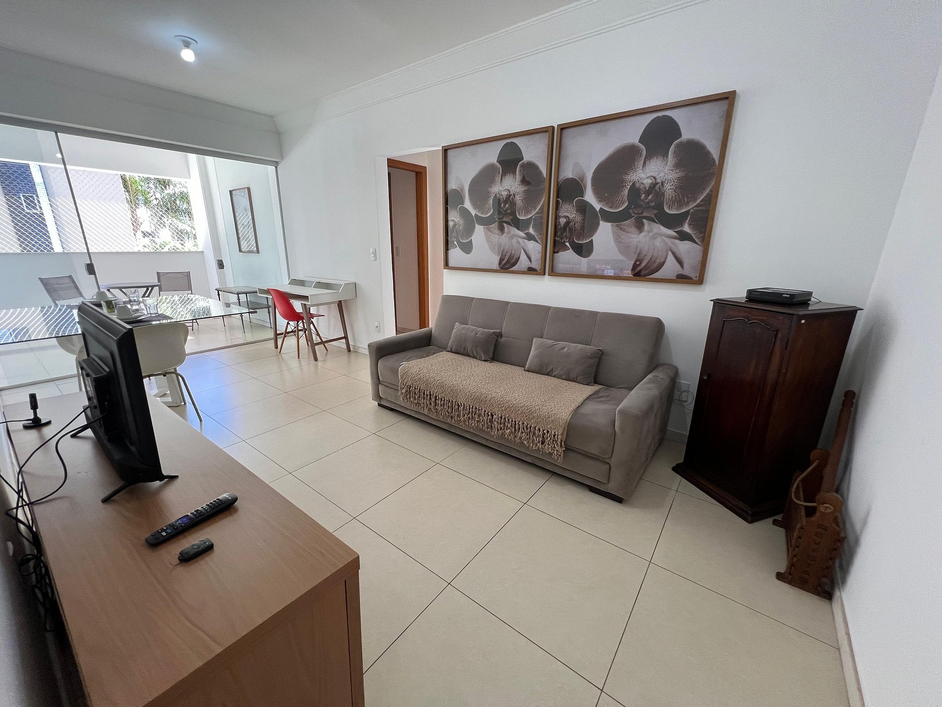 A suíte possui uma cama box de casal padrão, uma mesa de cabeceira e armário com cabides. O segundo quarto possui também uma cama de casal, mesa de cabeceira e uma estande em aramado cromado. Os quartos e banheiros possuem travesseiros, roupa de cama e banho. A sala de estar possui um ambiente com uma estação de trabalho, o outro ambiente conta com um sofá cama em tecido para duas pessoas, uma smart TV de 43”. O terraço possuir uma mesa com quatro cadeiras. A cozinha, com armários, está equipada com geladeira de 240 L, micro-ondas de 20L, fogão de quatro bocas com acendimento automático, sanduicheira, cafeteria elétrica e liquidificador. Além de jogo de panelas, taboa de corte, escorredor de macarrão, copos, pratos e talheres para seis pessoas, cafeteira, garrafa térmica e xícaras. A área de serviço possui um tanque de 20 litros, lavadora de roupas de 8 kg turbo, tábua e ferro de passar, varal de chão, cesto para roupa, balde, vassoura, rodo e pá, aspirador de pó, além de produtos básicos de limpeza.