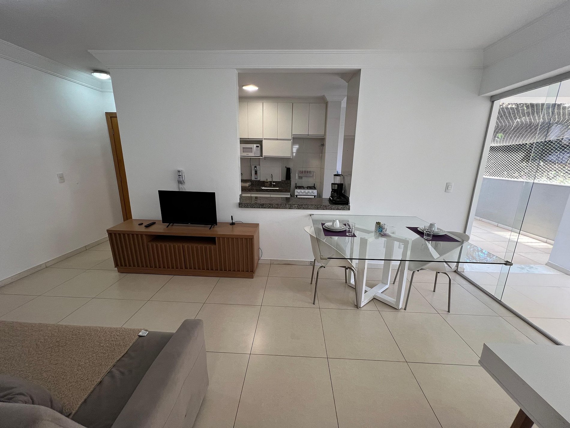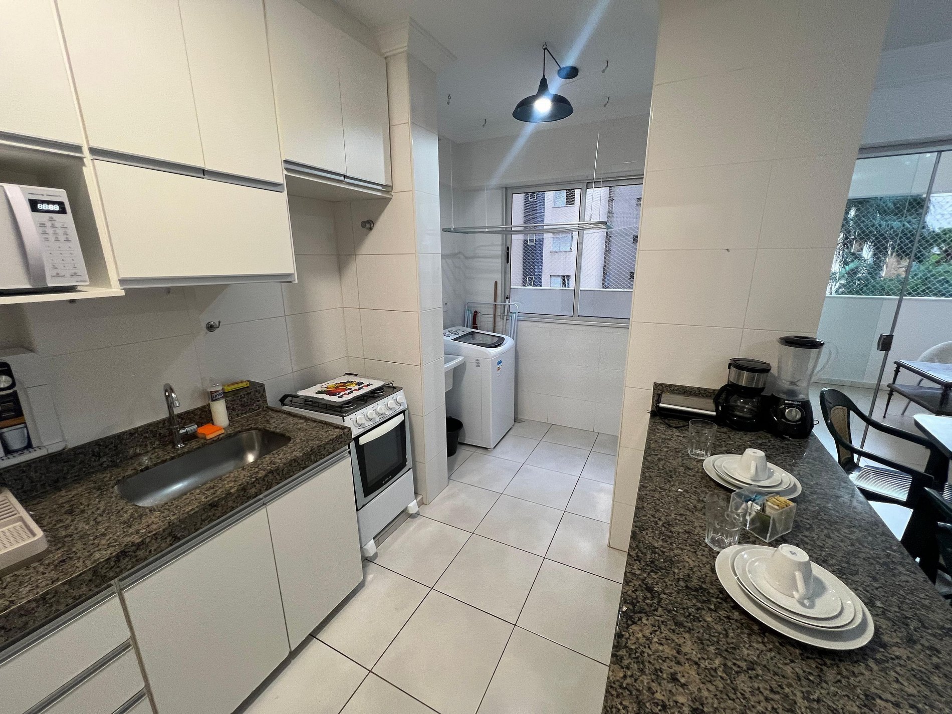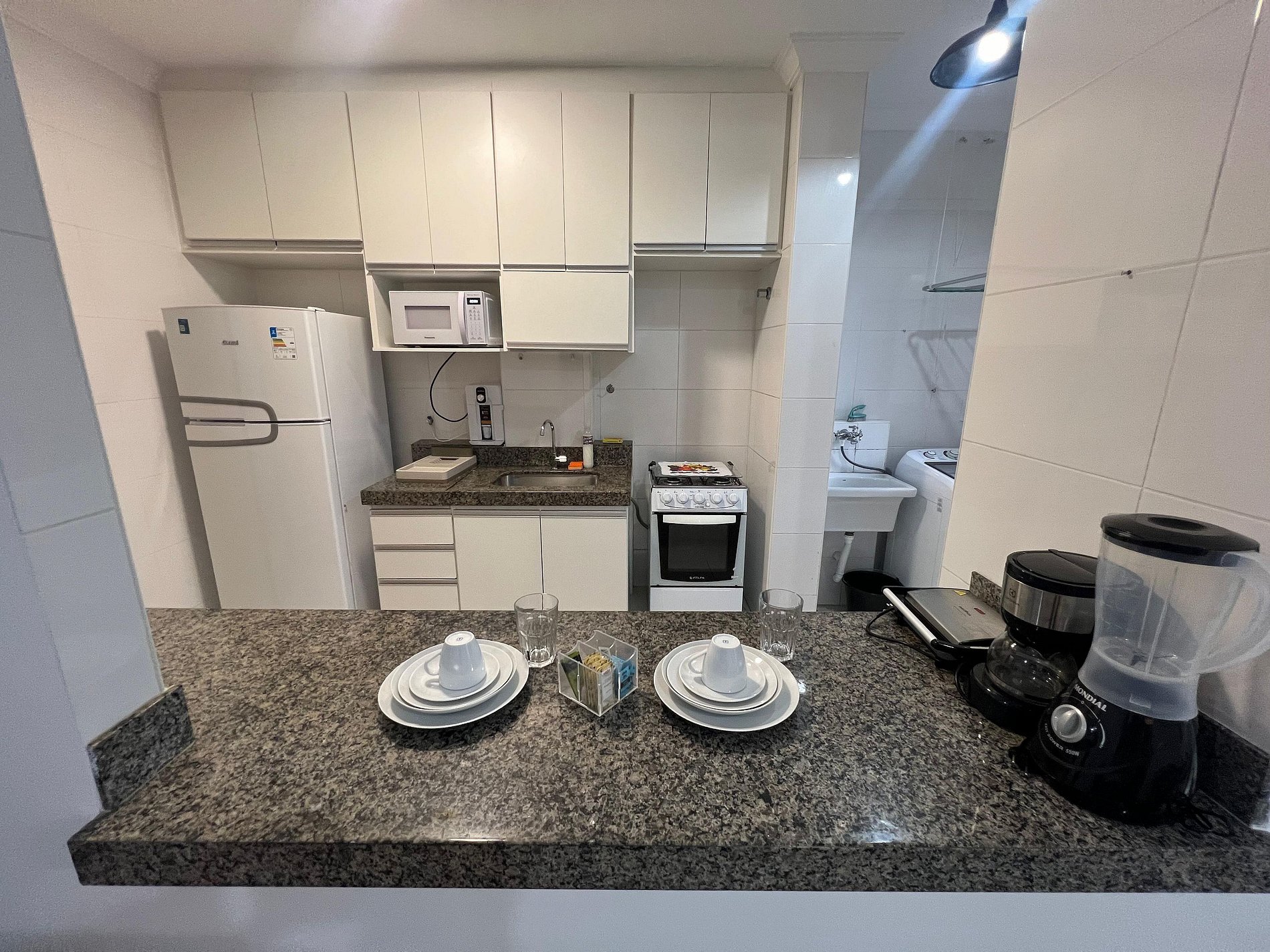 A suíte possui uma cama box de casal padrão, uma mesa de cabeceira e armário com cabides. O segundo quarto possui também uma cama de casal, mesa de cabeceira e uma estande em aramado cromado. Os quartos e banheiros possuem travesseiros, roupa de cama e banho. A sala de estar possui um ambiente com uma estação de trabalho, o outro ambiente conta com um sofá cama em tecido para duas pessoas, uma smart TV de 43”. O terraço possuir uma mesa com quatro cadeiras. A cozinha, com armários, está equipada com geladeira de 240 L, micro-ondas de 20L, fogão de quatro bocas com acendimento automático, sanduicheira, cafeteria elétrica e liquidificador. Além de jogo de panelas, taboa de corte, escorredor de macarrão, copos, pratos e talheres para seis pessoas, cafeteira, garrafa térmica e xícaras. A área de serviço possui um tanque de 20 litros, lavadora de roupas de 8 kg turbo, tábua e ferro de passar, varal de chão, cesto para roupa, balde, vassoura, rodo e pá, aspirador de pó, além de produtos básicos de limpeza.