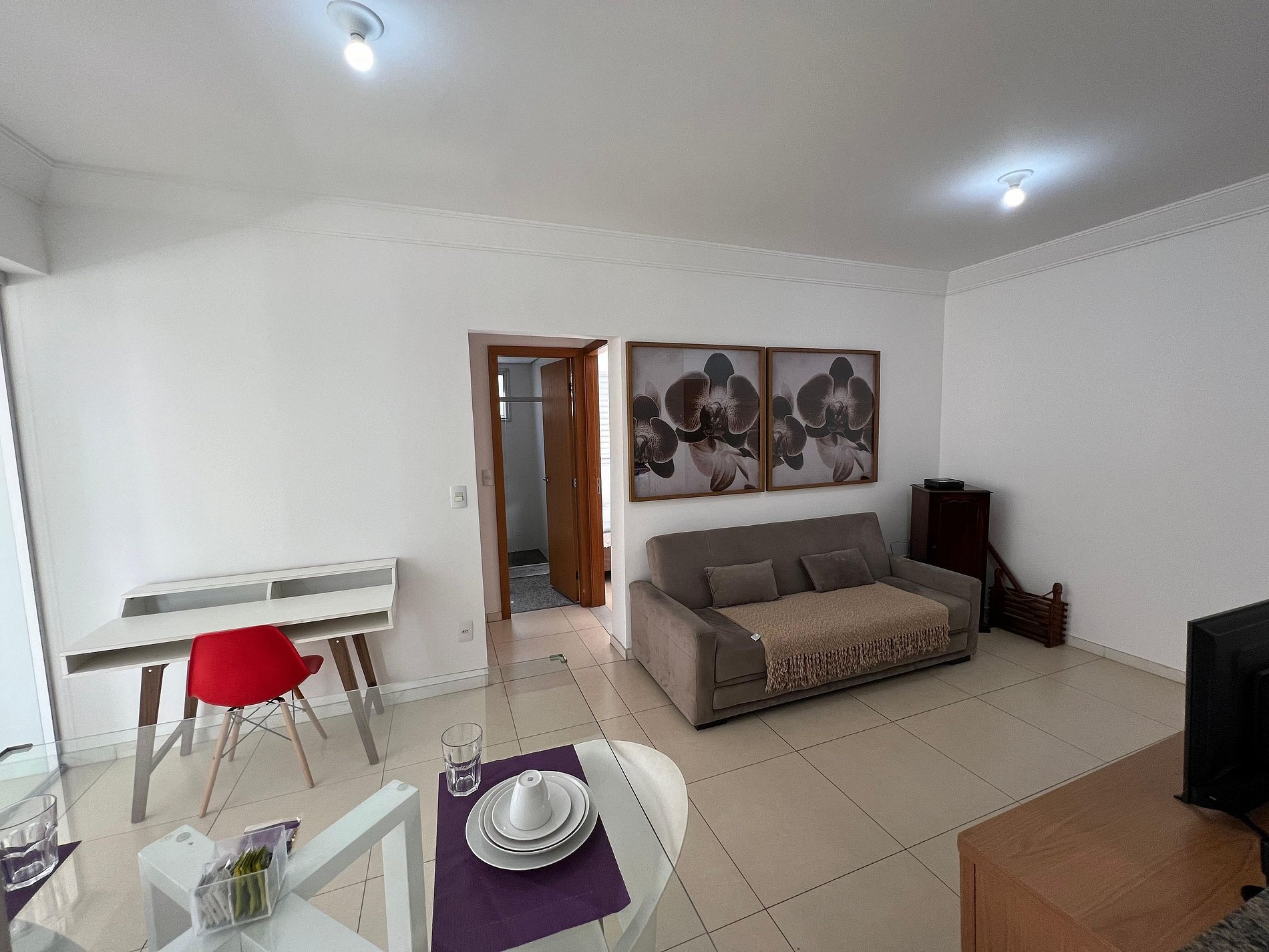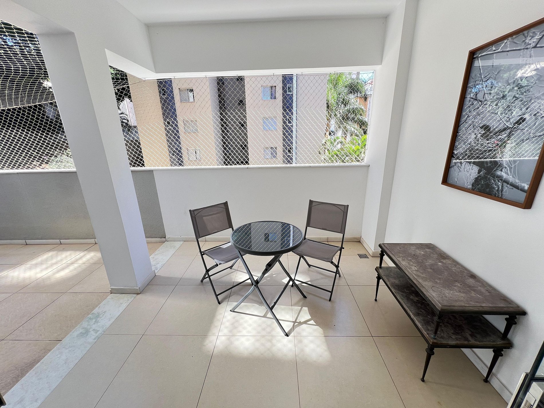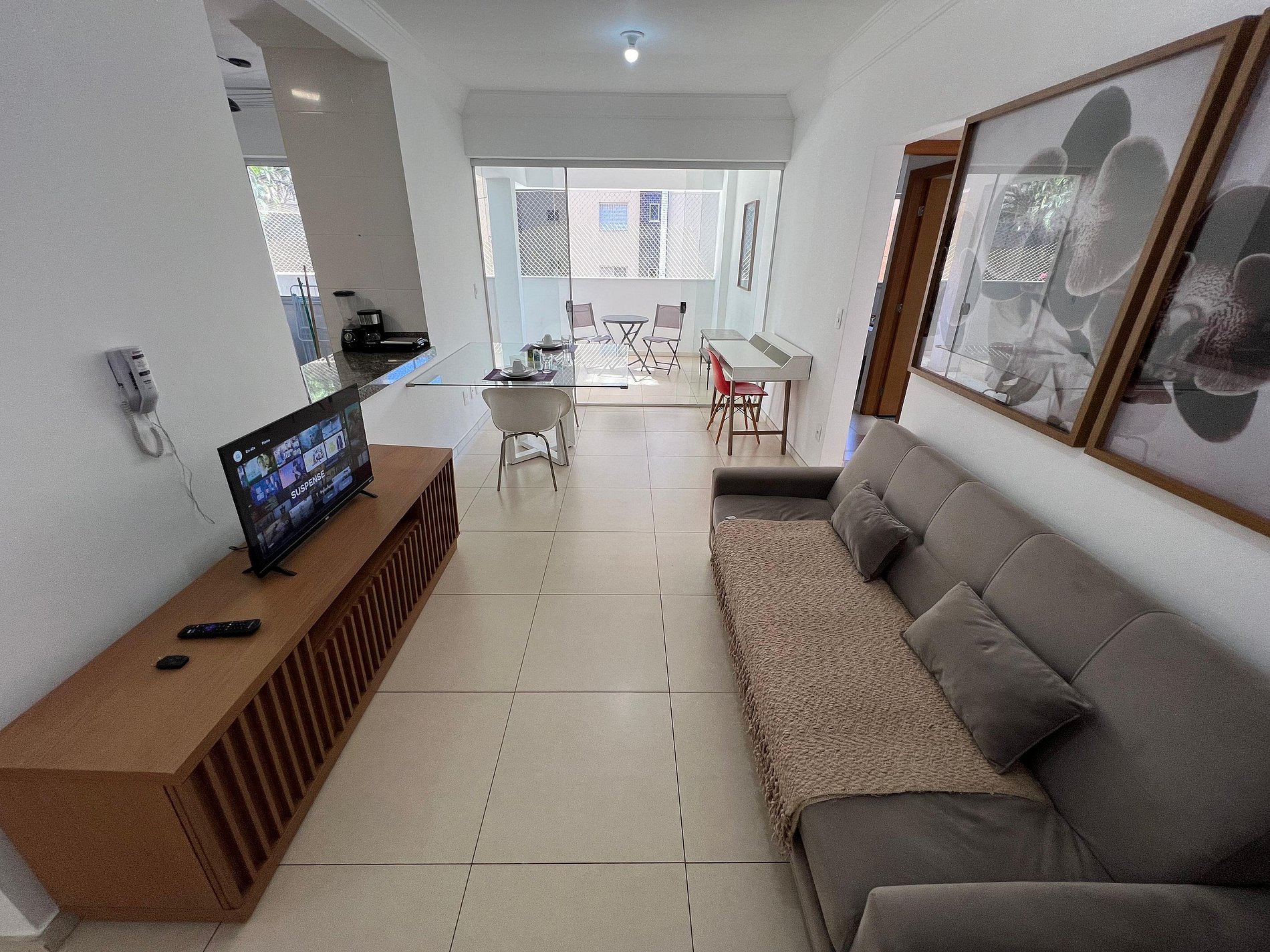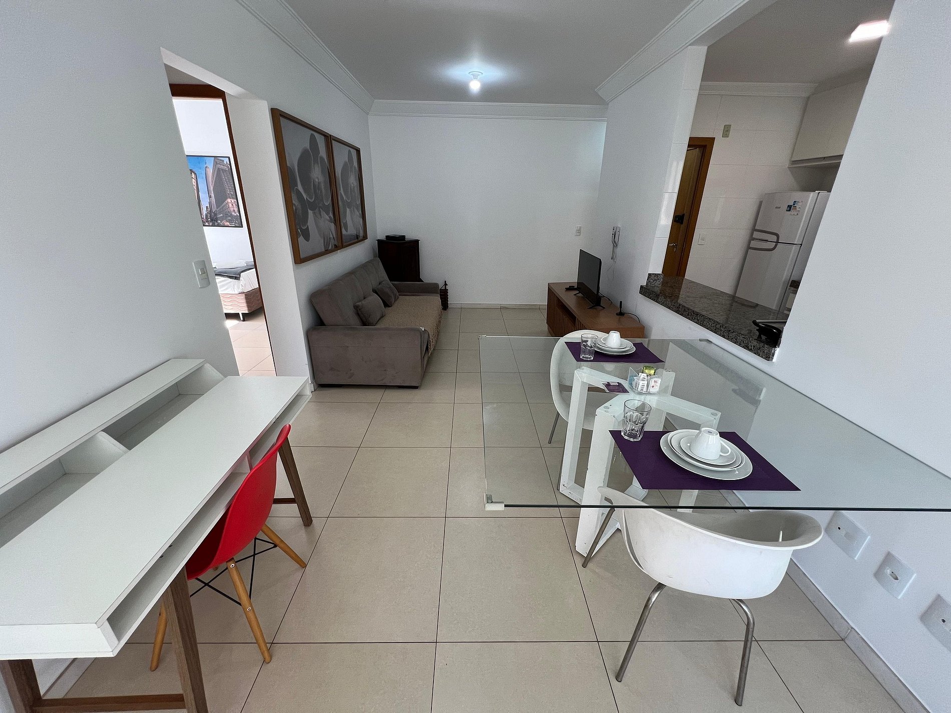 A suíte possui uma cama box de casal padrão, uma mesa de cabeceira e armário com cabides. O segundo quarto possui também uma cama de casal, mesa de cabeceira e uma estande em aramado cromado. Os quartos e banheiros possuem travesseiros, roupa de cama e banho. A sala de estar possui um ambiente com uma estação de trabalho, o outro ambiente conta com um sofá cama em tecido para duas pessoas, uma smart TV de 43”. O terraço possuir uma mesa com quatro cadeiras. A cozinha, com armários, está equipada com geladeira de 240 L, micro-ondas de 20L, fogão de quatro bocas com acendimento automático, sanduicheira, cafeteria elétrica e liquidificador. Além de jogo de panelas, taboa de corte, escorredor de macarrão, copos, pratos e talheres para seis pessoas, cafeteira, garrafa térmica e xícaras. A área de serviço possui um tanque de 20 litros, lavadora de roupas de 8 kg turbo, tábua e ferro de passar, varal de chão, cesto para roupa, balde, vassoura, rodo e pá, aspirador de pó, além de produtos básicos de limpeza.