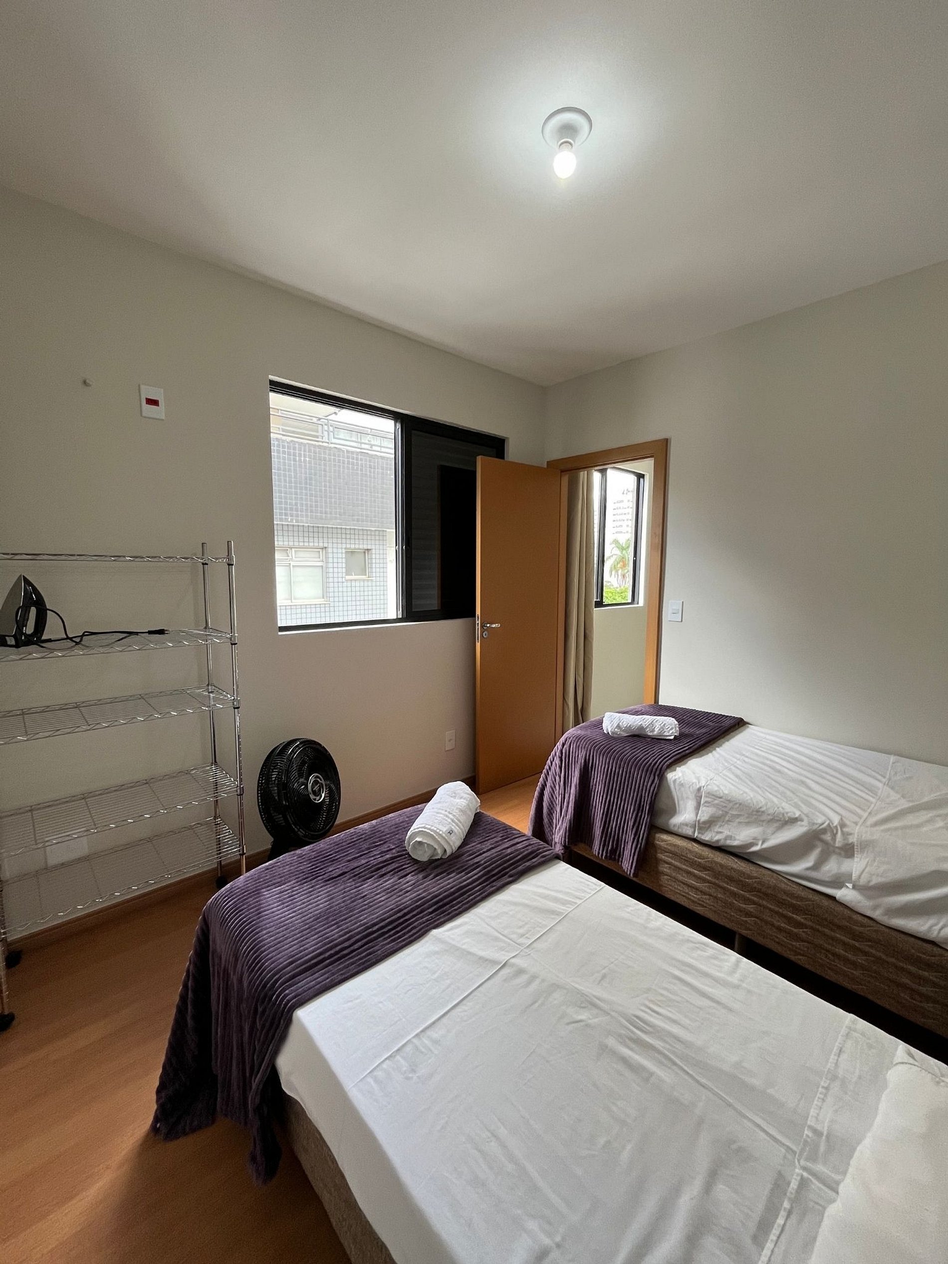 Duas suítes, sendo 01 com cama de casal e arara para roupas, e 01 com duas camas de solteiro e arara para roupas.