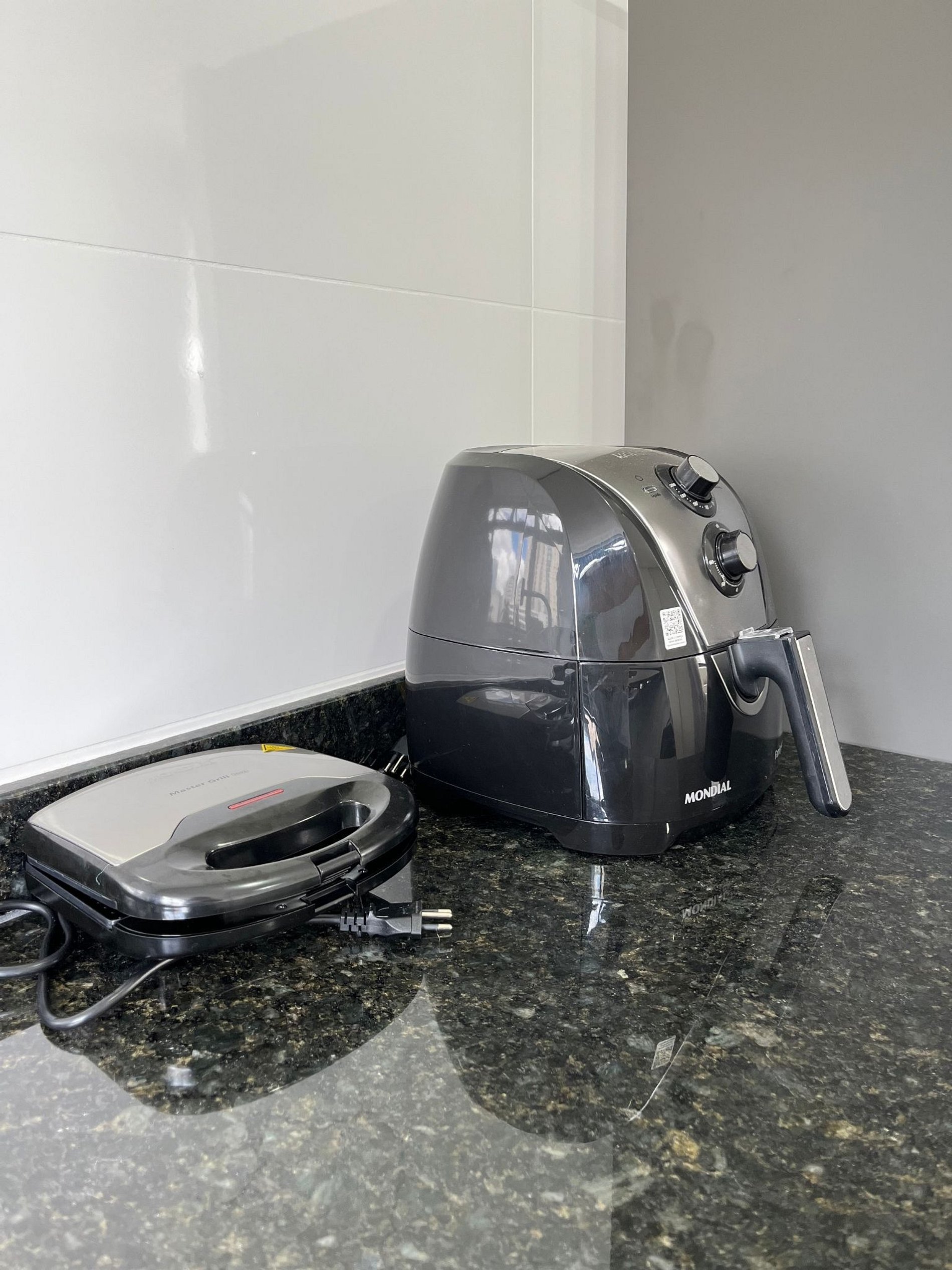 A sala de estar possui um ambiente com sala de televisão e uma estação de trabalho (uma mesa com cadeira). Conta ainda com sofá-cama, uma cama de solteiro e um lavabo. O outro ambiente é uma cozinha americana com armários, bancada com quatro outras cadeiras, e está equipada com geladeira, forno de Micro-ondas de 20L, cooktop de quatro bocas, sanduicheira inox grill, liquidificador, garrafa térmica com base de filtro para café e cafeteira elétrica. A cozinha possui também copos, taças, pratos rasos, pratos fundos, tigelas e talheres e xícaras para quatro pessoas. Está disponível ferro, tábua de passar e produtos de limpeza.