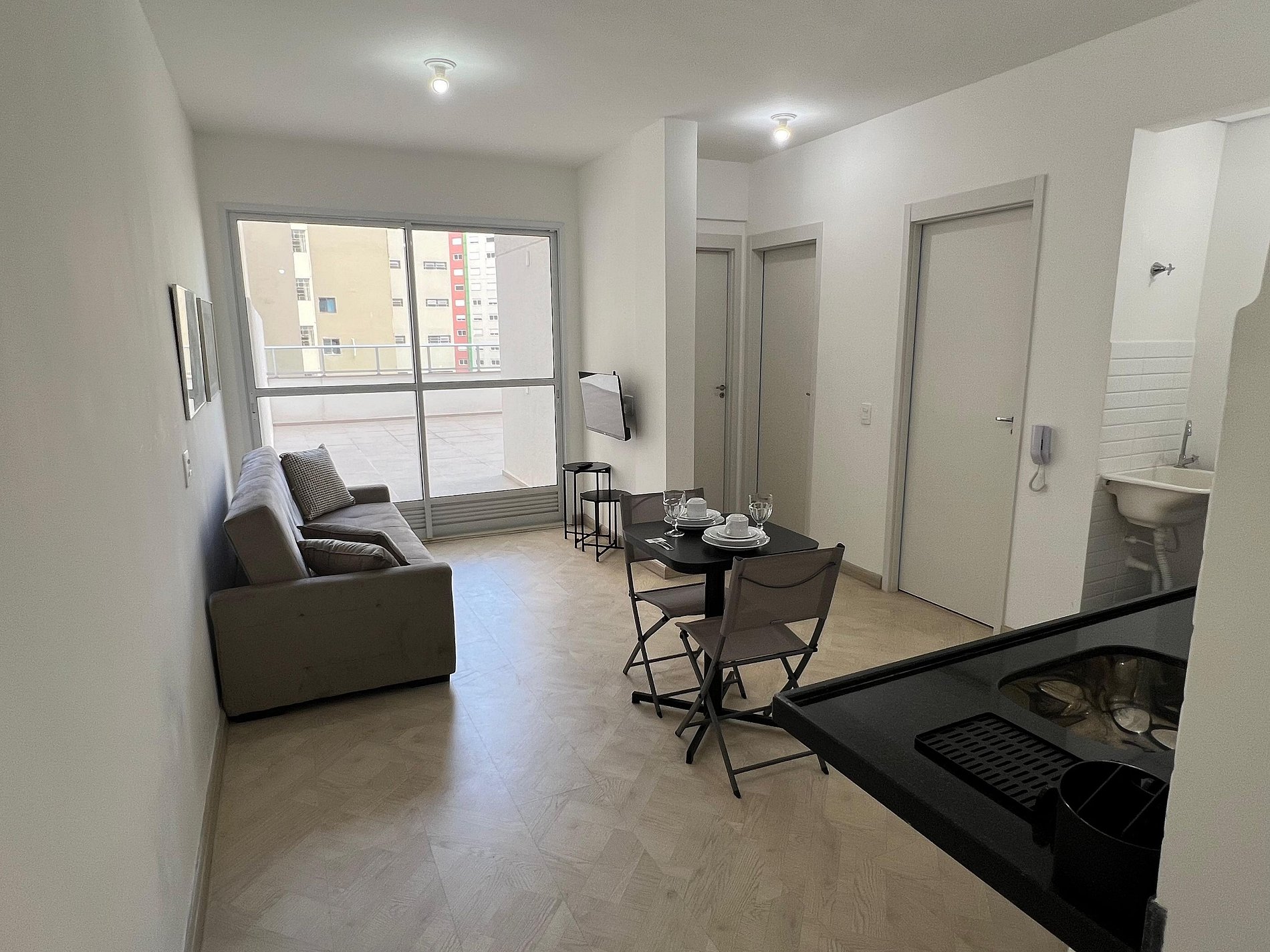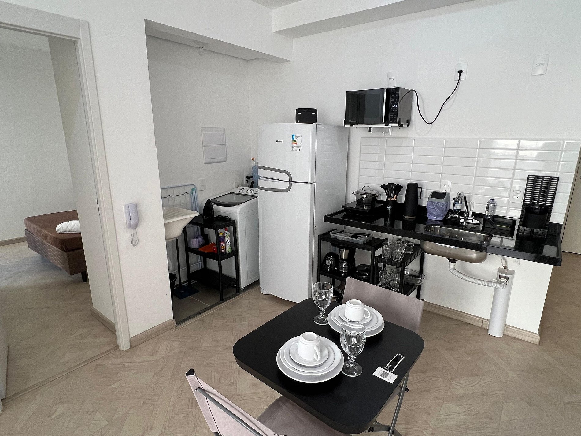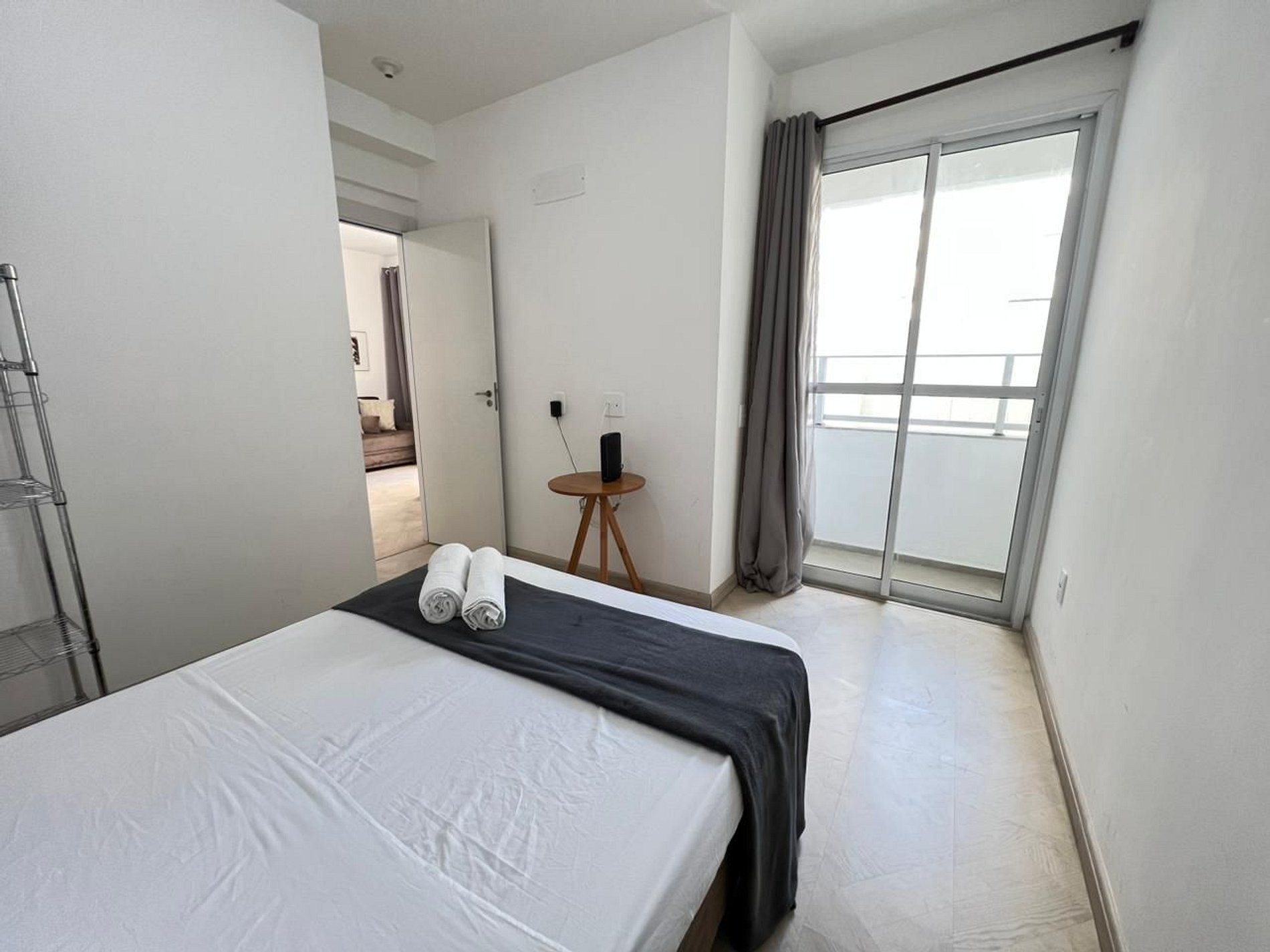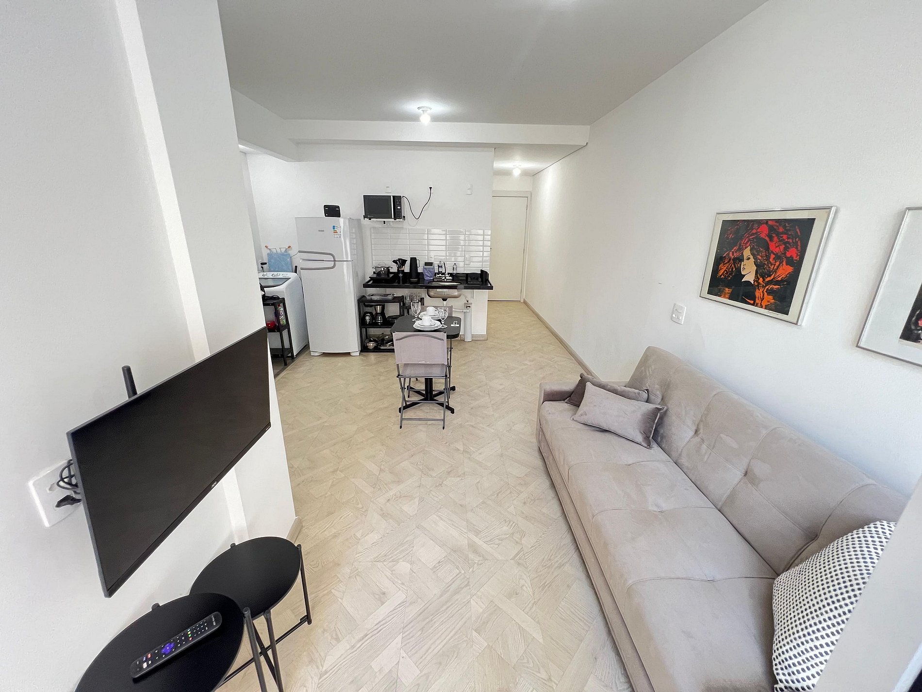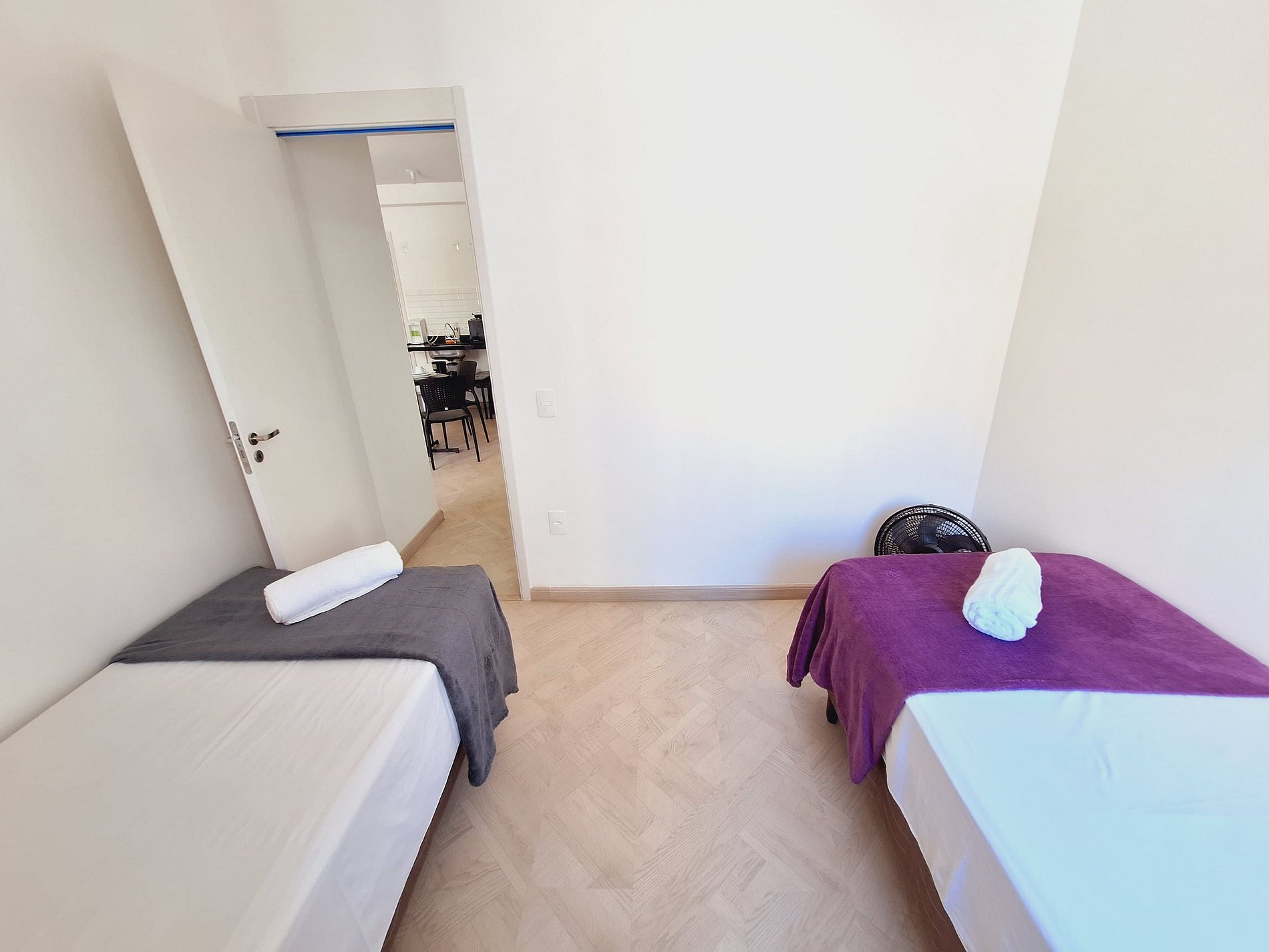 A suíte possui uma cama de casal, varanda, uma mesa de cabeceira e aramados com cabides. O segundo quarto conta com duas camas de solteiro. O apartamento oferece travesseiros, roupa de cama e banho, shampoo e sabonete. A sala de estar possui 02 ambientes, sendo um ambiente com uma uma mesa com quatro cadeiras para refeição e trabalho e um sofá com televisão 43". Entrada para a área privativa do apartamento. O outro ambiente é uma cozinha americana , e está equipada com refrigerador, fogão de indução, micro-ondas de 20L, sanduicheira inox grill, liquidificador, garrafa térmica com base de filtro para café e cafeteira elétrica. Máquina de lavar e produtos de limpeza à disposição. A cozinha possui também copos, taças, pratos rasos, pratos fundos, tigelas e talheres e xícaras para quatro pessoas. Está disponível ferro e tábua de passar.