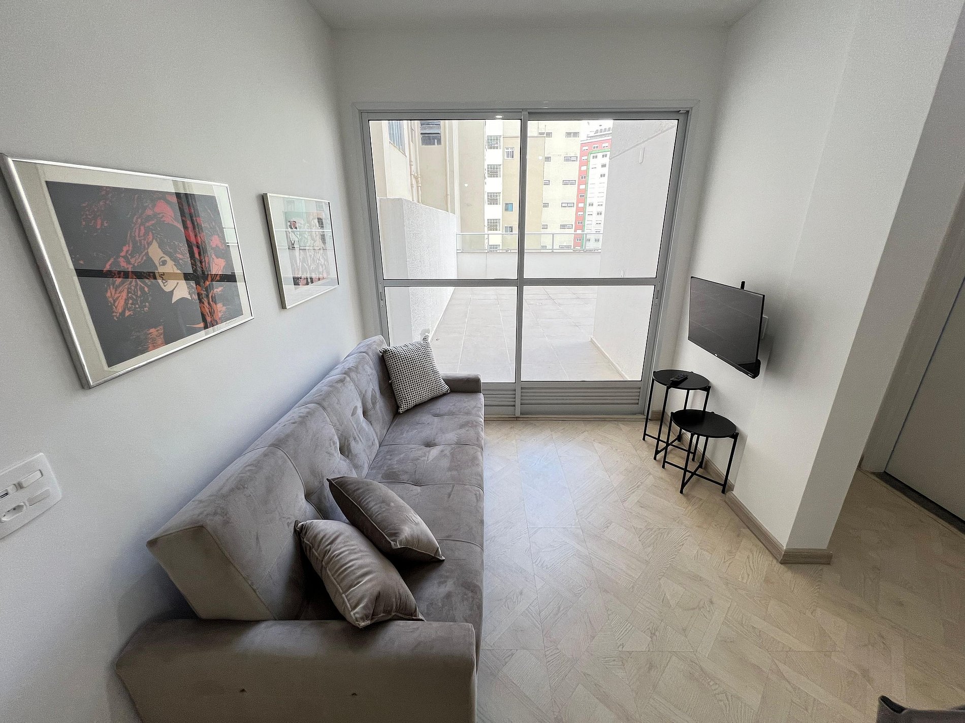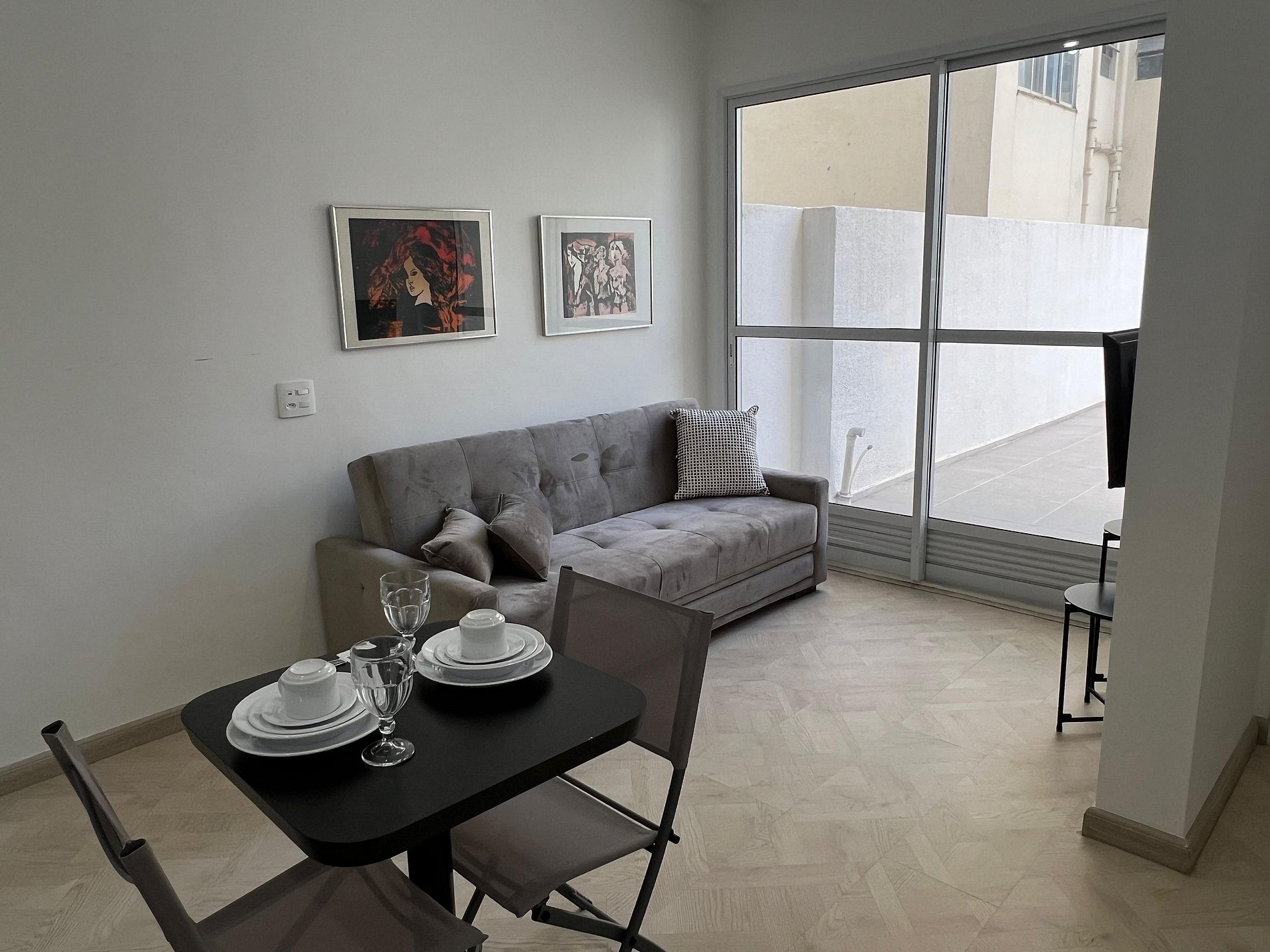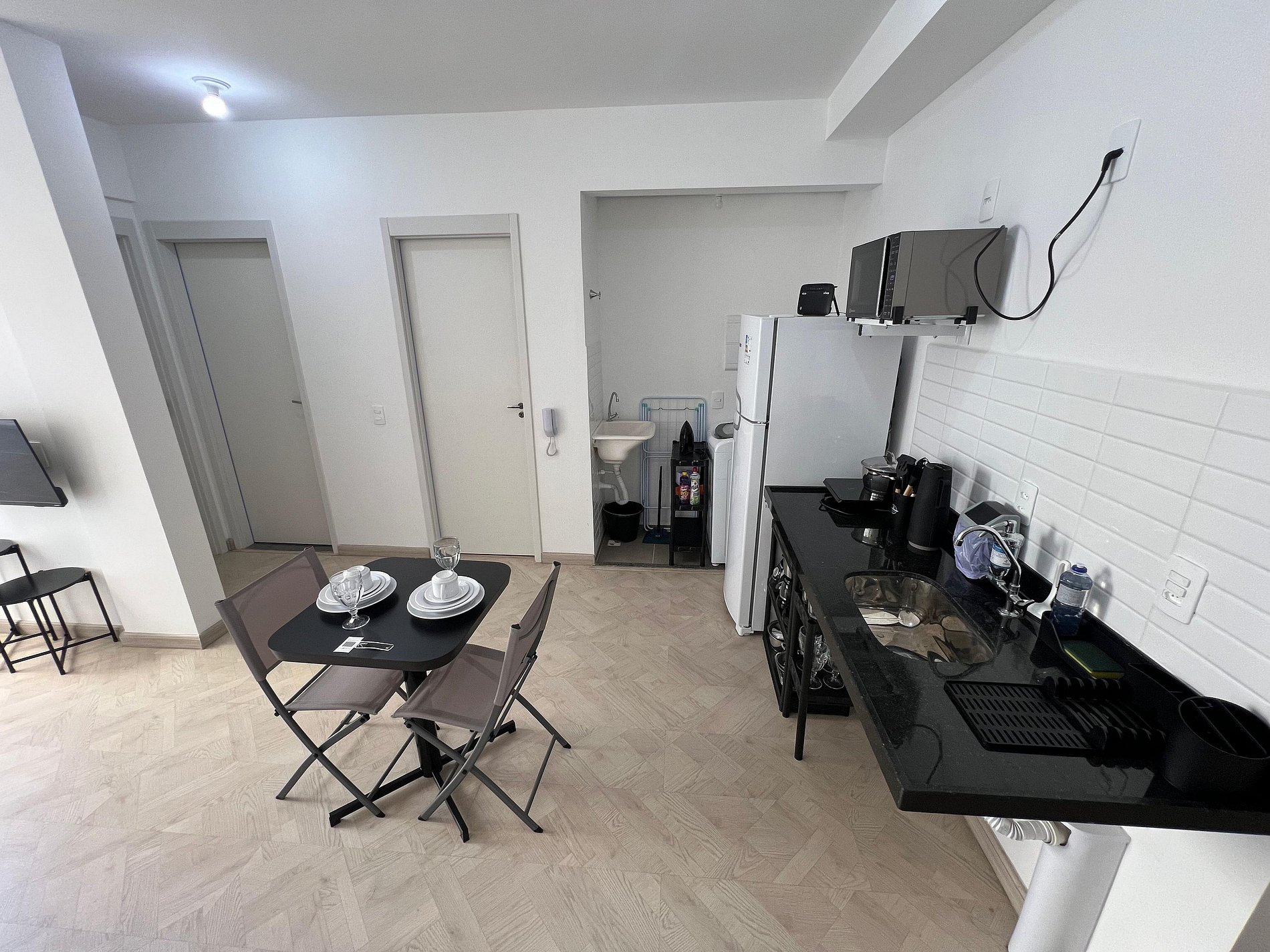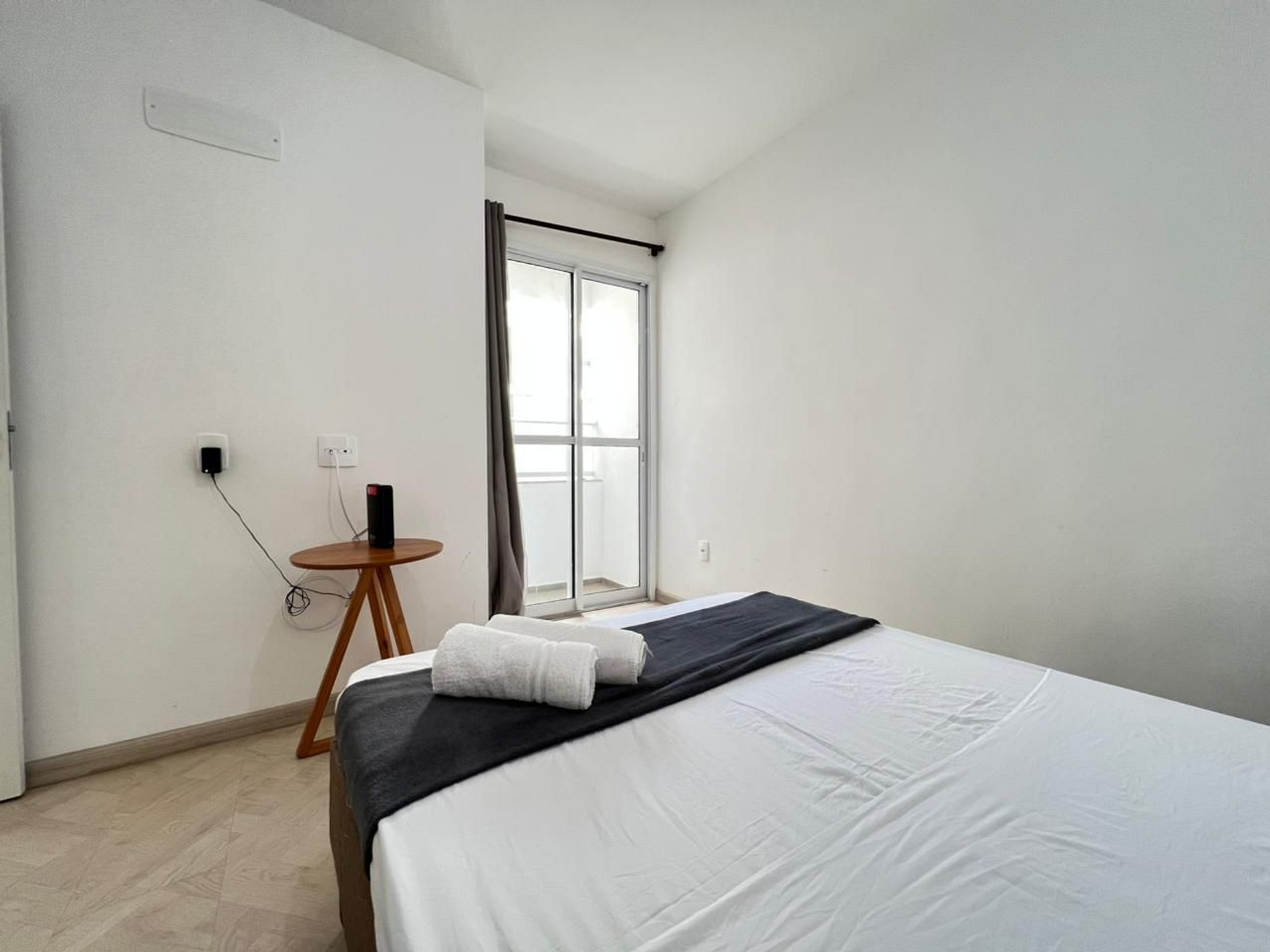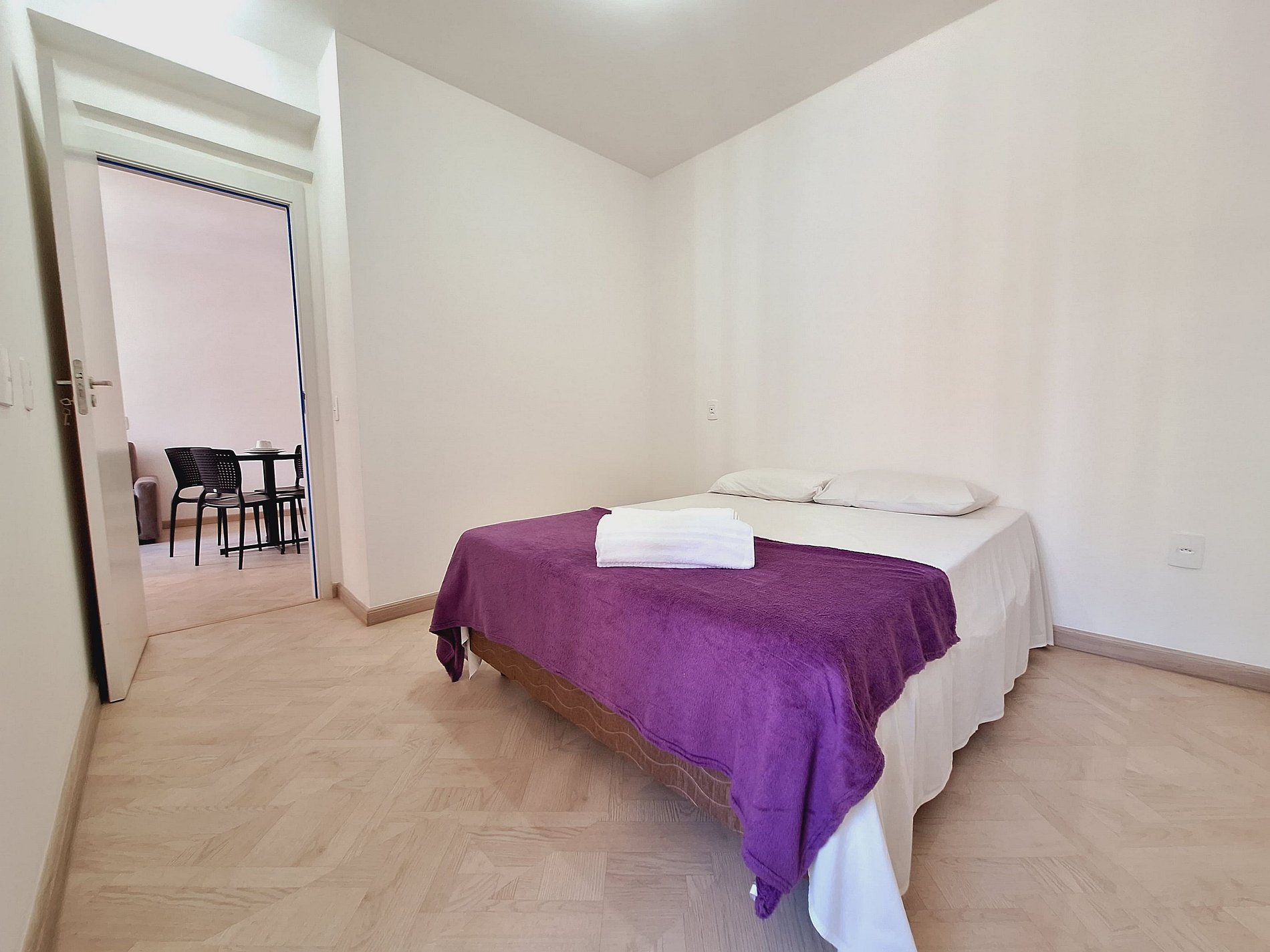 A suíte possui uma cama de casal, varanda, uma mesa de cabeceira e aramados com cabides. O segundo quarto conta com duas camas de solteiro. O apartamento oferece travesseiros, roupa de cama e banho, shampoo e sabonete. A sala de estar possui 02 ambientes, sendo um ambiente com uma uma mesa com quatro cadeiras para refeição e trabalho e um sofá com televisão 43". Entrada para a área privativa do apartamento. O outro ambiente é uma cozinha americana , e está equipada com refrigerador, fogão de indução, micro-ondas de 20L, sanduicheira inox grill, liquidificador, garrafa térmica com base de filtro para café e cafeteira elétrica. Máquina de lavar e produtos de limpeza à disposição. A cozinha possui também copos, taças, pratos rasos, pratos fundos, tigelas e talheres e xícaras para quatro pessoas. Está disponível ferro e tábua de passar.