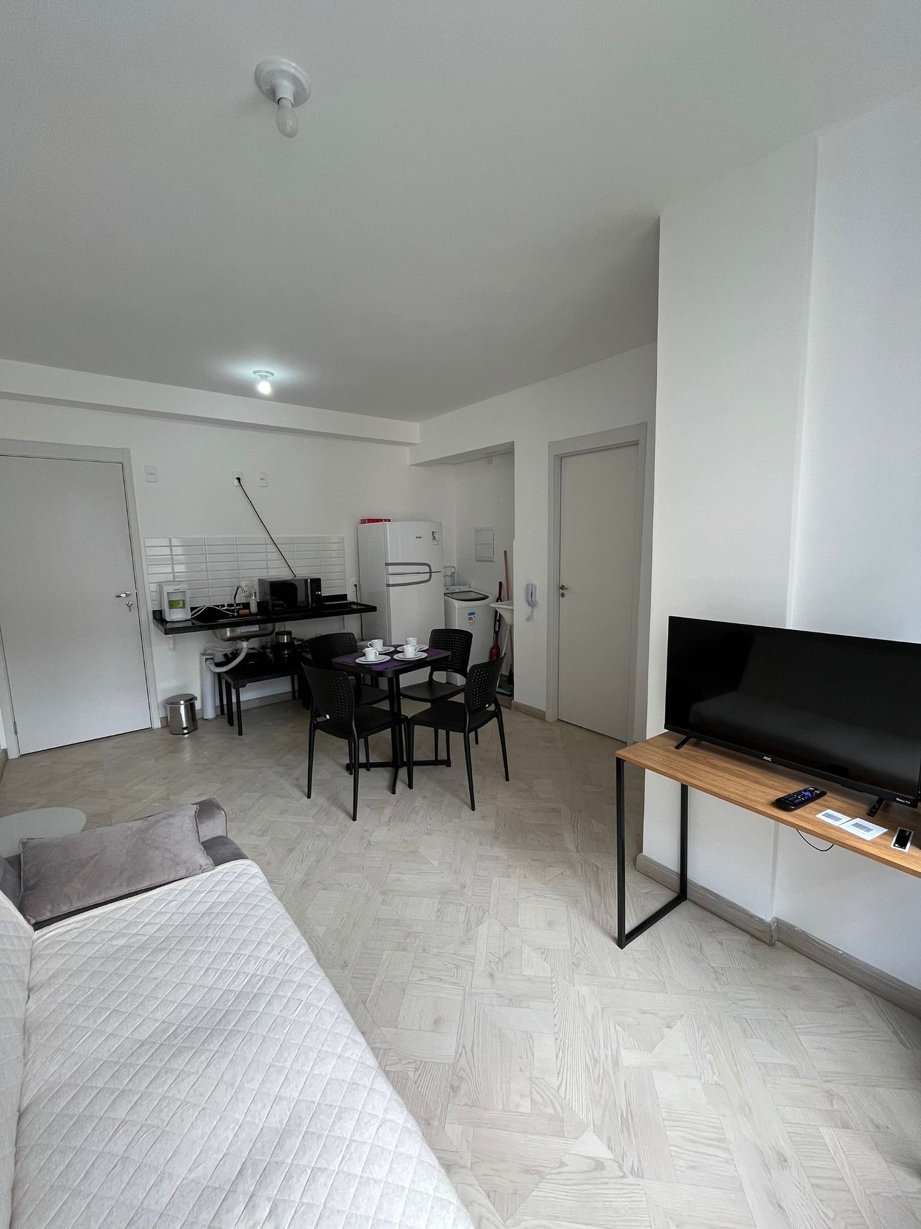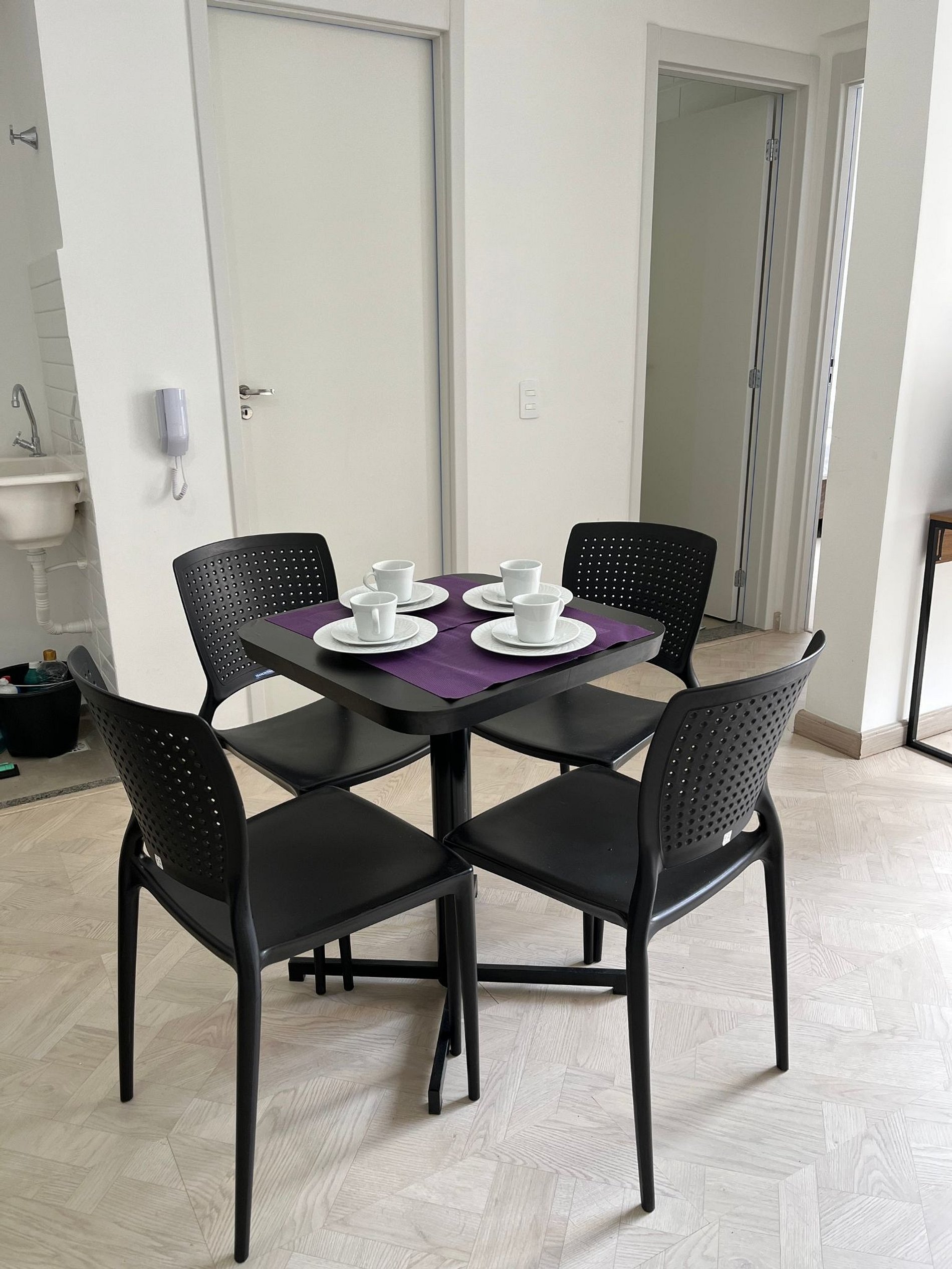 - Ambiente 1: mesa com 4 cadeiras (ideal para refeições ou trabalho), sofá confortável e TV de 43”.