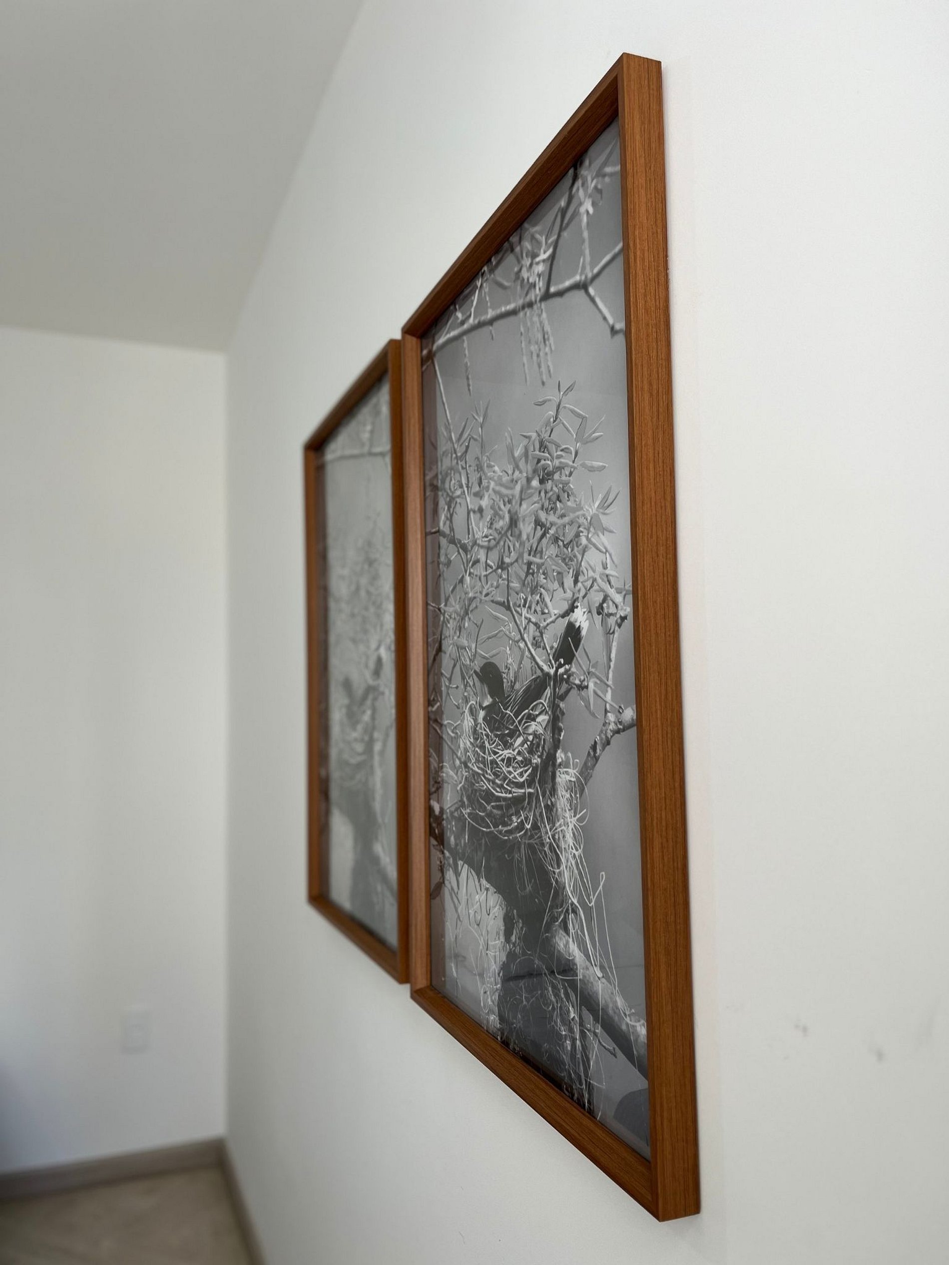 - Quarto 1: cama de casal, varanda privativa, mesa de cabeceira e aramado com cabides.