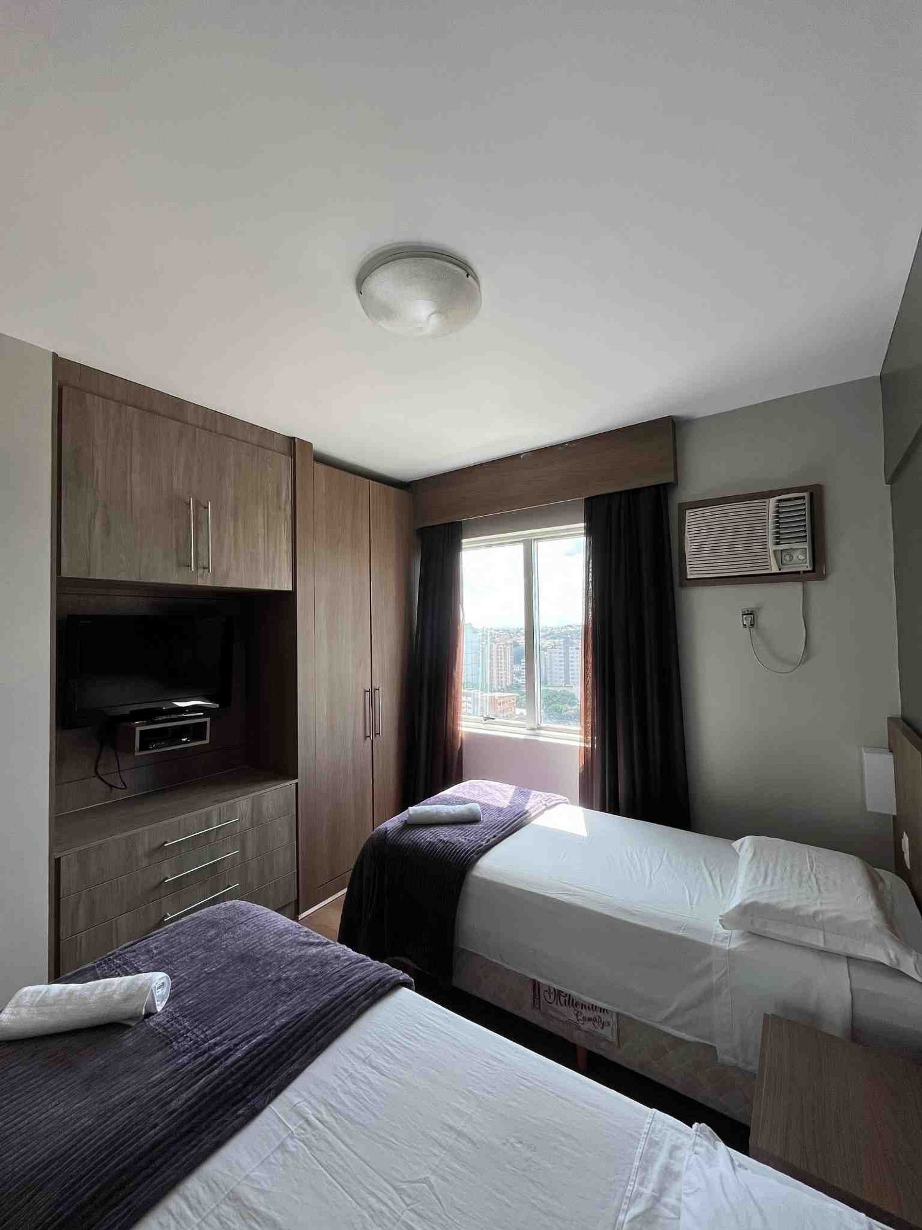 A primeira suíte possui uma cama box queen, uma mesa de cabeceira com luminária e armário com cabides e televisão. A segunda suíte possui duas camas de solteiro assim como o terceiro quarto, O apartamento oferece travesseiros, roupa de cama e banho, shampoo e sabonete. A sala de estar possui um sofá-cama em tecido para duas pessoas, e uma mesa de jantar para quatro pessoas. O outro ambiente é uma cozinha americana com armários, bancada com duas outras cadeiras, e está equipada com refrigerador tipo frigobar, forno de Micro-ondas de 20L, cooktop de duas bocas, sanduicheira inox grill, liquidificador, garrafa térmica com base de filtro para café e cafeteira elétrica. A cozinha possui também copos, taças, pratos rasos, pratos fundos, tigelas e talheres e xícaras. Estão disponíveis ferro, tábua de passar e produtos de limpeza.
