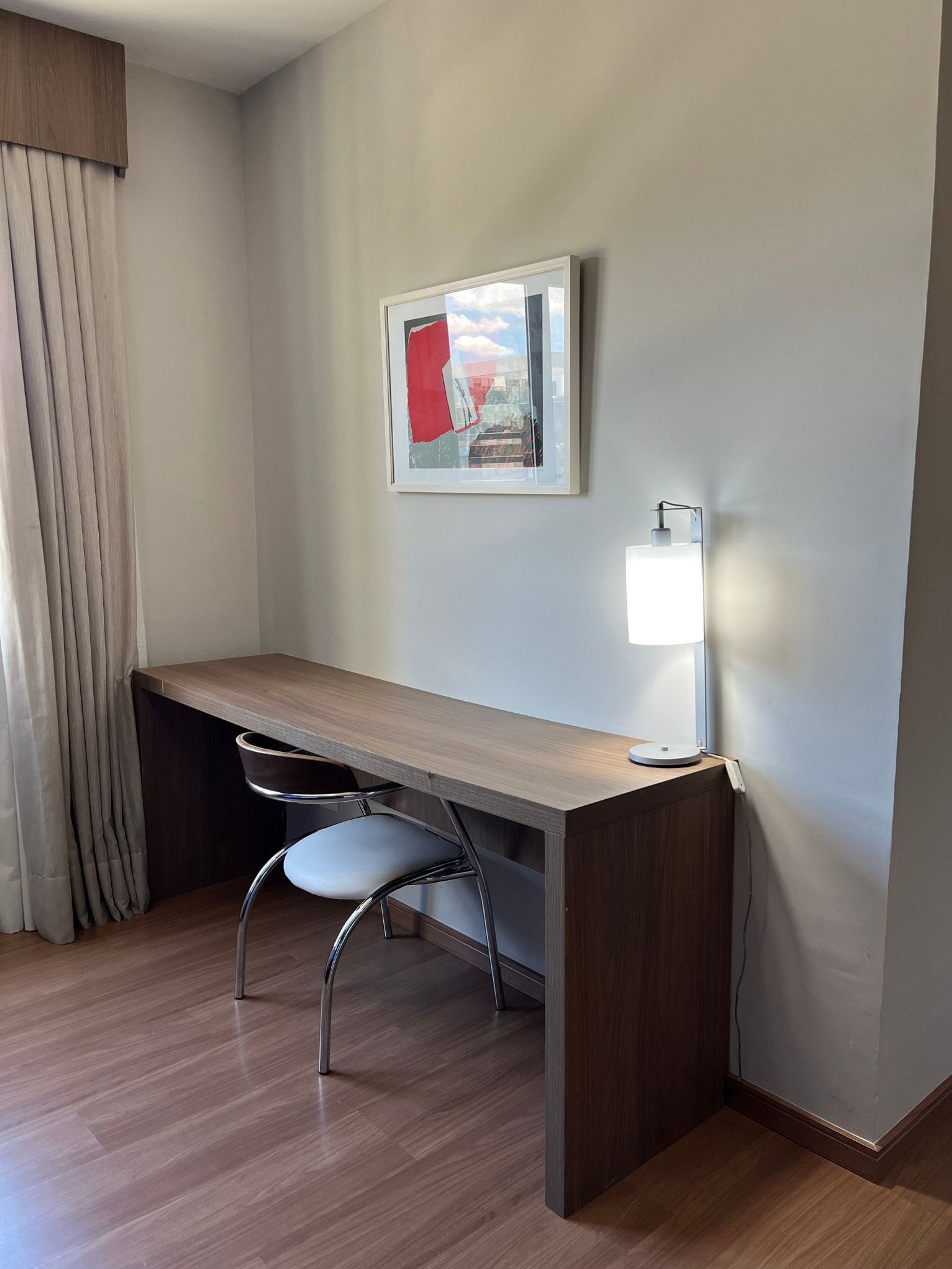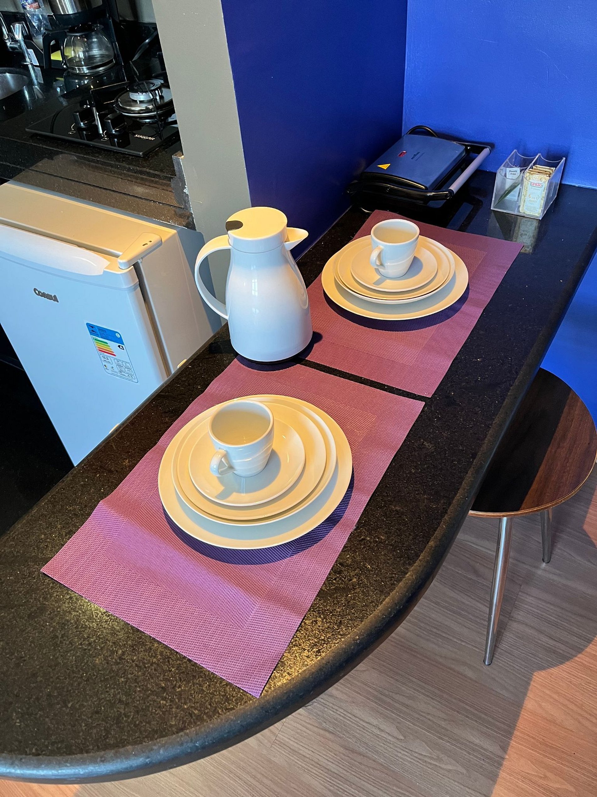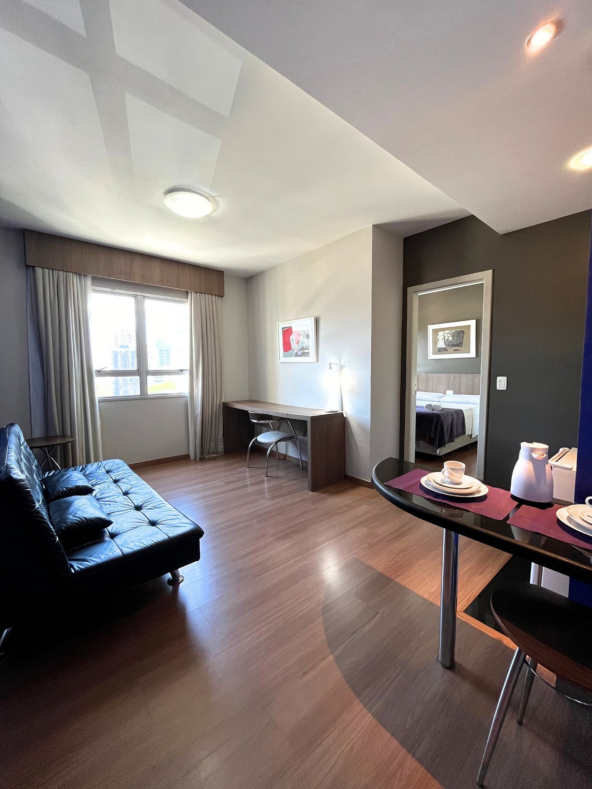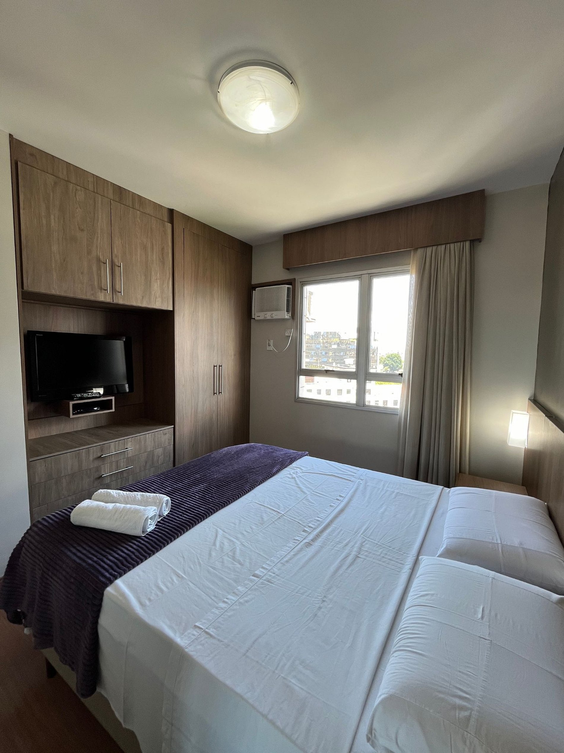 A suíte possui duas camas de solteiro, uma mesa de cabeceira e armário com cabides e televisão. O apartamento oferece travesseiros, roupa de cama e banho, shampoo e sabonete. A sala de estar possui um ambiente com uma estação de trabalho e uma mesa com duas cadeiras, um sofá-cama casal. O outro ambiente é uma cozinha americana com armários, bancada com duas outras cadeiras, e está equipada com refrigerador tipo frigobar, forno de Micro-ondas de 20L, cooktop de duas bocas, sanduicheira inox grill, liquidificador, garrafa térmica com base de filtro para café e cafeteira elétrica. A cozinha possui também copos, taças, pratos rasos, pratos fundos, tigelas e talheres e xícaras para quatro pessoas. Está disponível ferro, tábua de passar e produtos de limpeza.