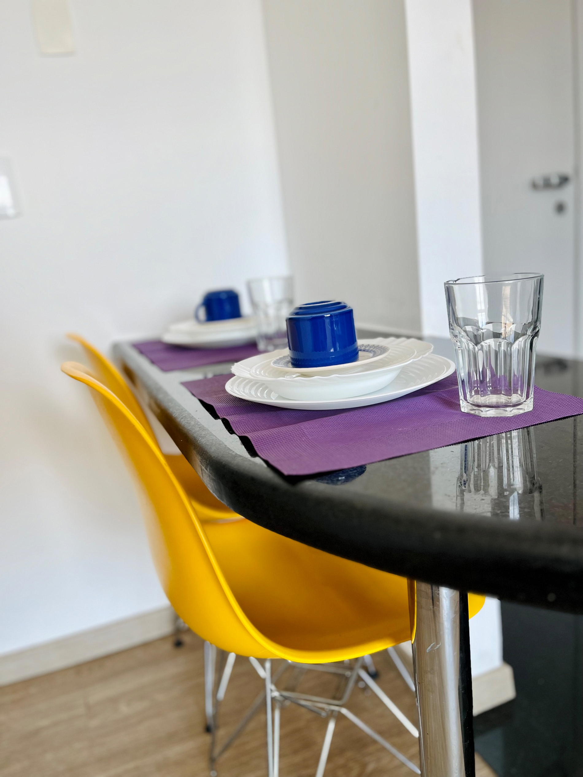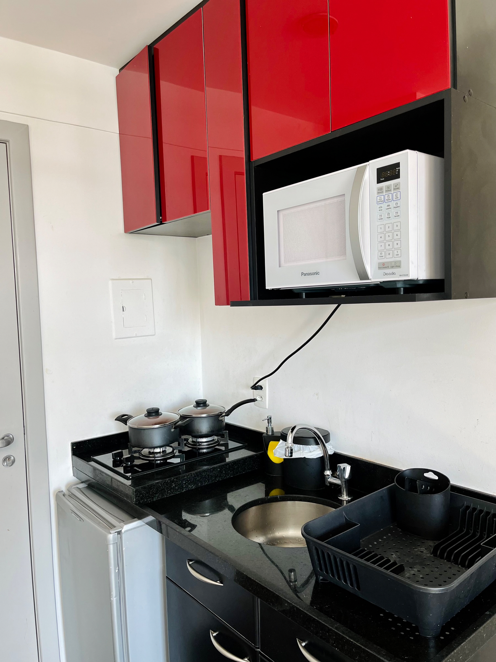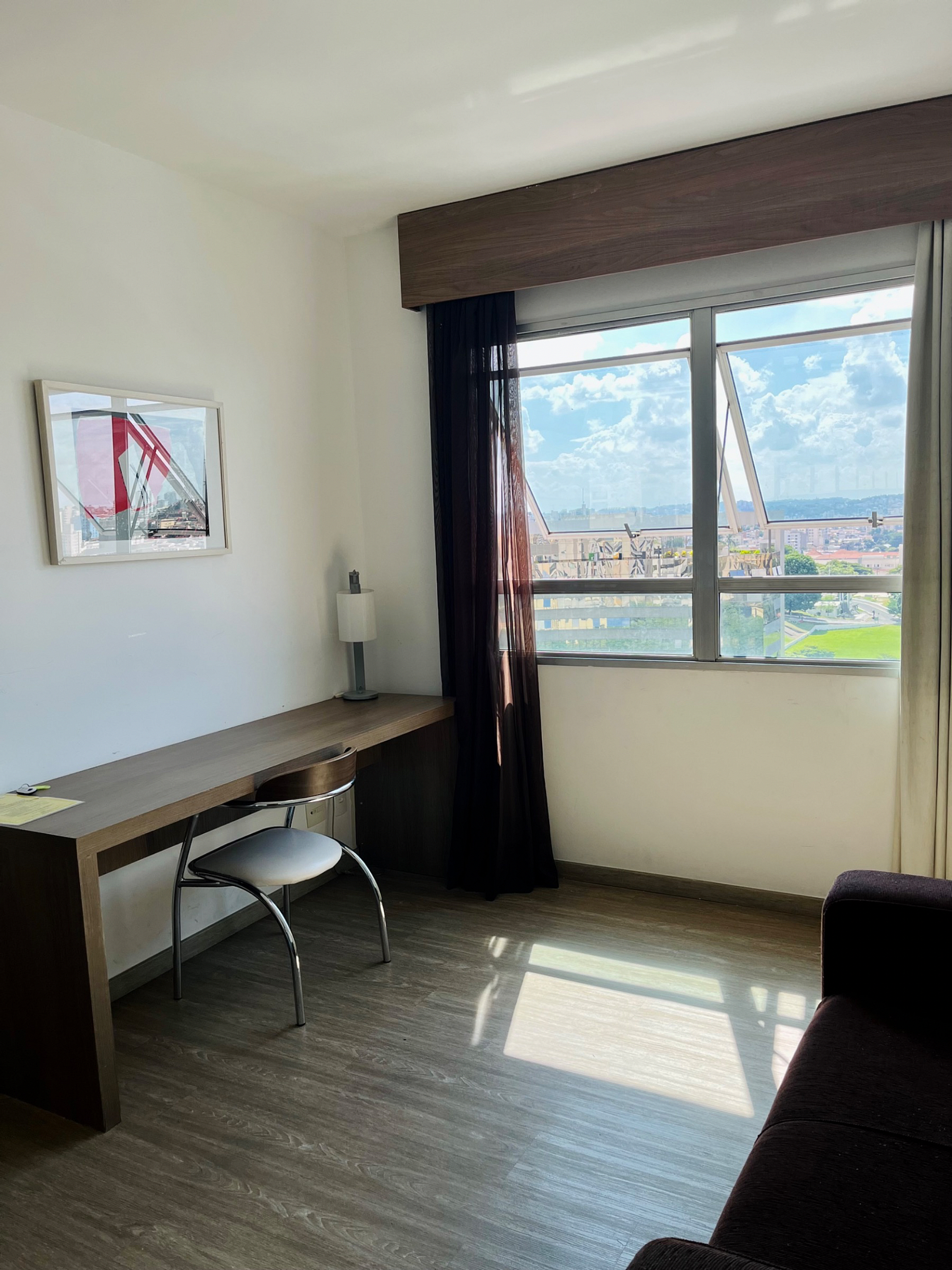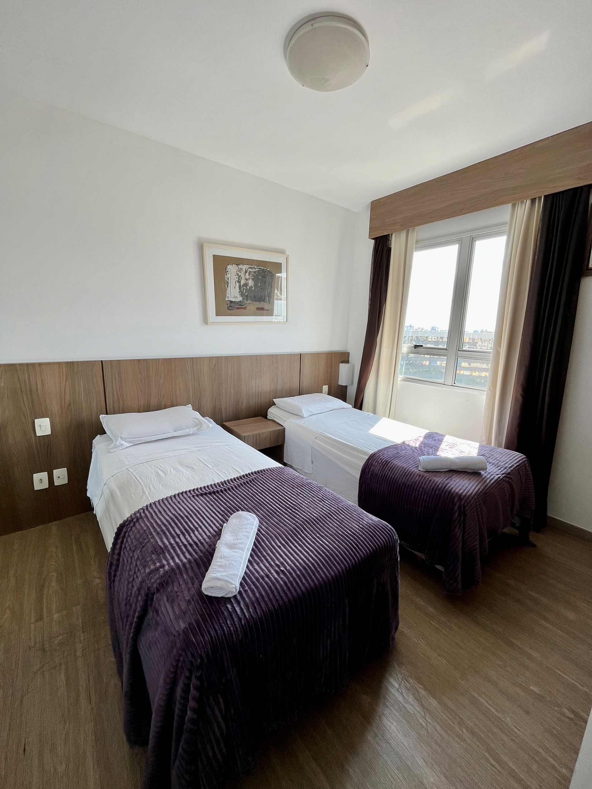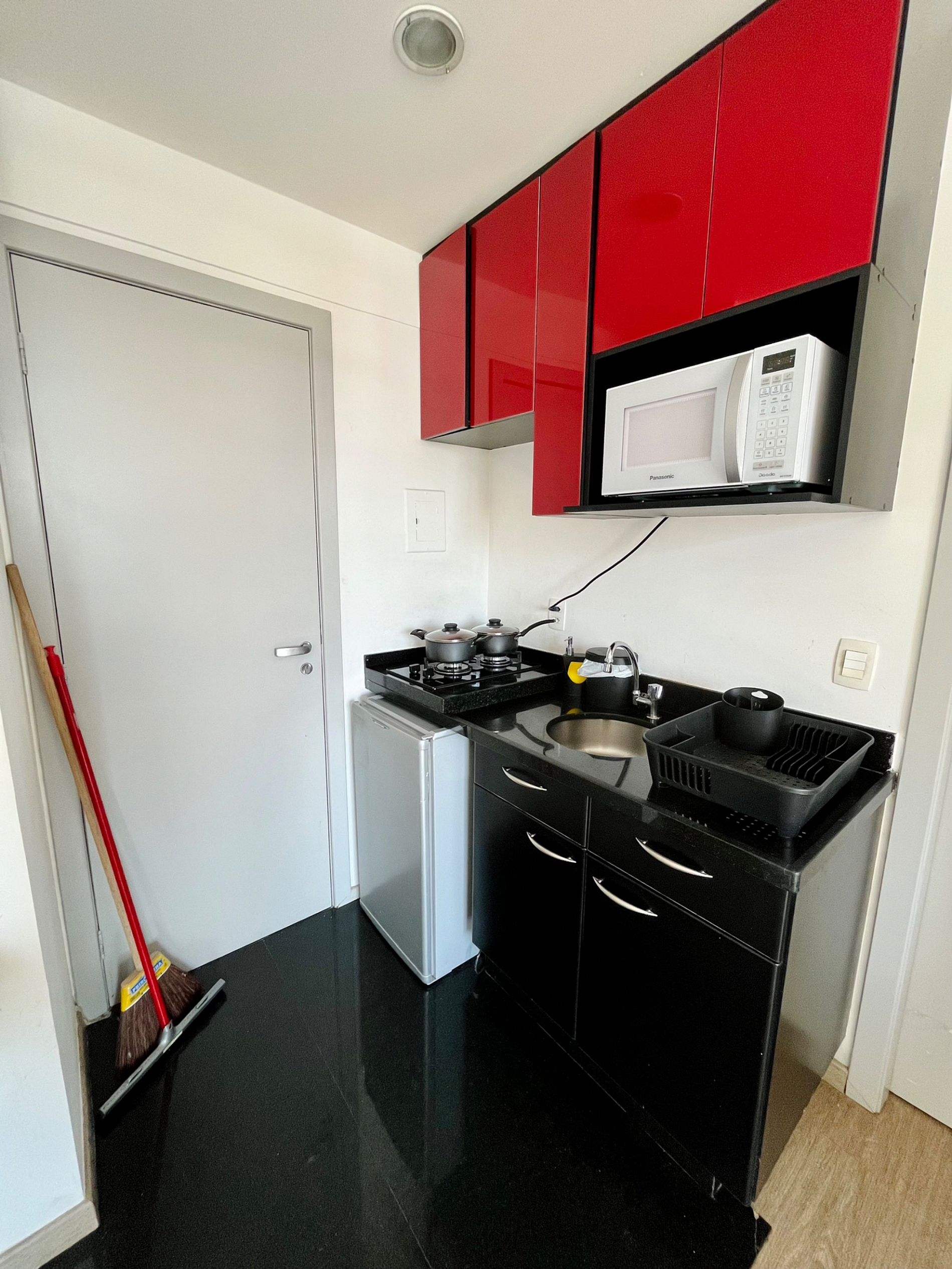 A suíte possui duas camas de solteiro, um criado e armário com cabides e televisão. O apartamento oferece travesseiros, roupa de cama e banho, shampoo e sabonete. A sala de estar possui um ambiente com uma estação de trabalho e uma mesa com duas cadeiras, um sofá-cama em tecido para duas pessoas. O outro ambiente é uma cozinha americana com armários, bancada com duas outras cadeiras, e está equipada com refrigerador tipo frigobar, forno de Micro-ondas de 20L, cooktop de duas bocas, sanduicheira inox grill, liquidificador, garrafa térmica com base de filtro para café e cafeteira elétrica. A cozinha possui também copos, taças, pratos rasos, pratos fundos, tigelas e talheres e xícaras para quatro pessoas. Estão disponíveis ferro, tábua de passar e produtos de limpeza.