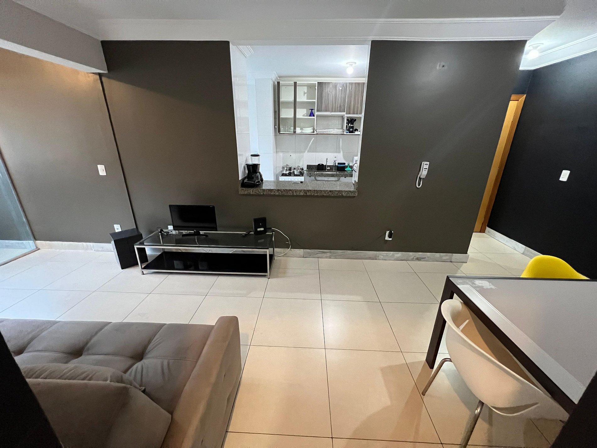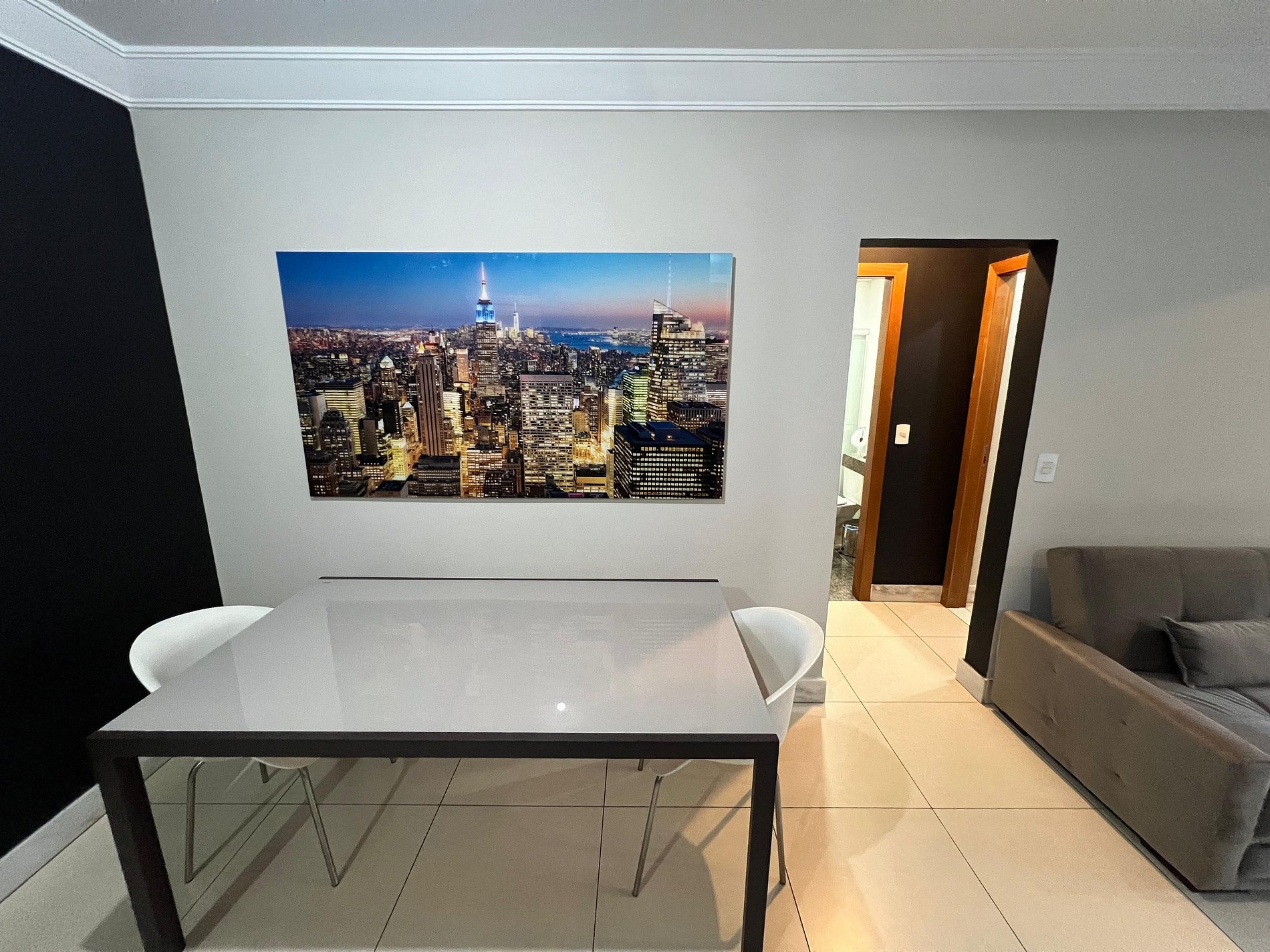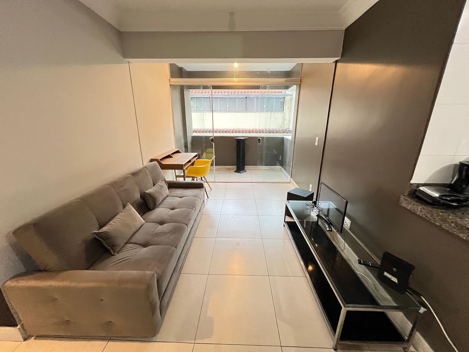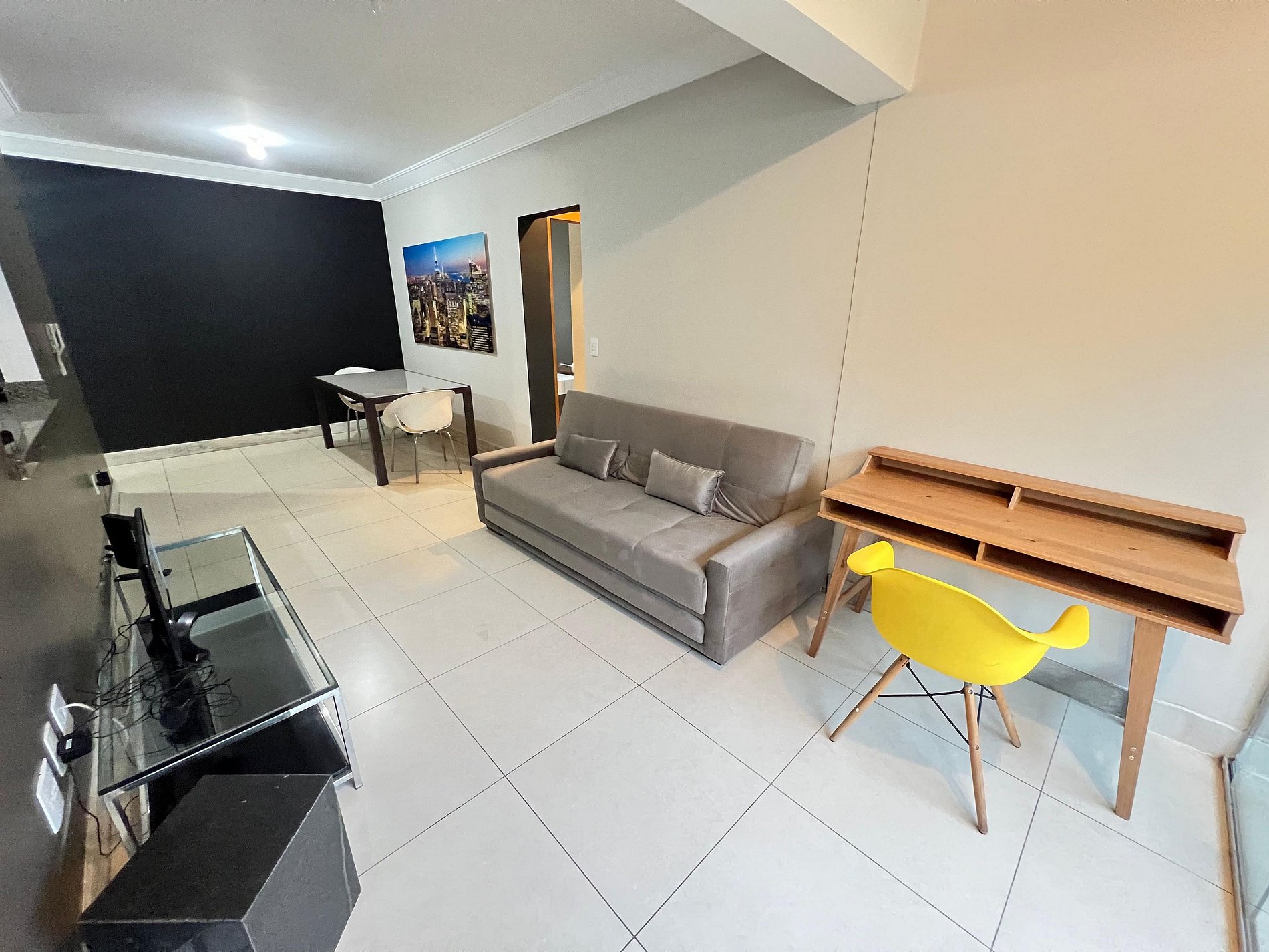 A sala de estar é dividida em dois ambientes: um com mesa de jantar e cadeiras para quatro pessoas, além de estação de trabalho ideal para quem precisa manter a produtividade durante a viagem, e outro com um sofá confortável para dois lugares e uma smart TV de 32” já conectada ao Wi-Fi. O apartamento conta com uma pequena varanda.