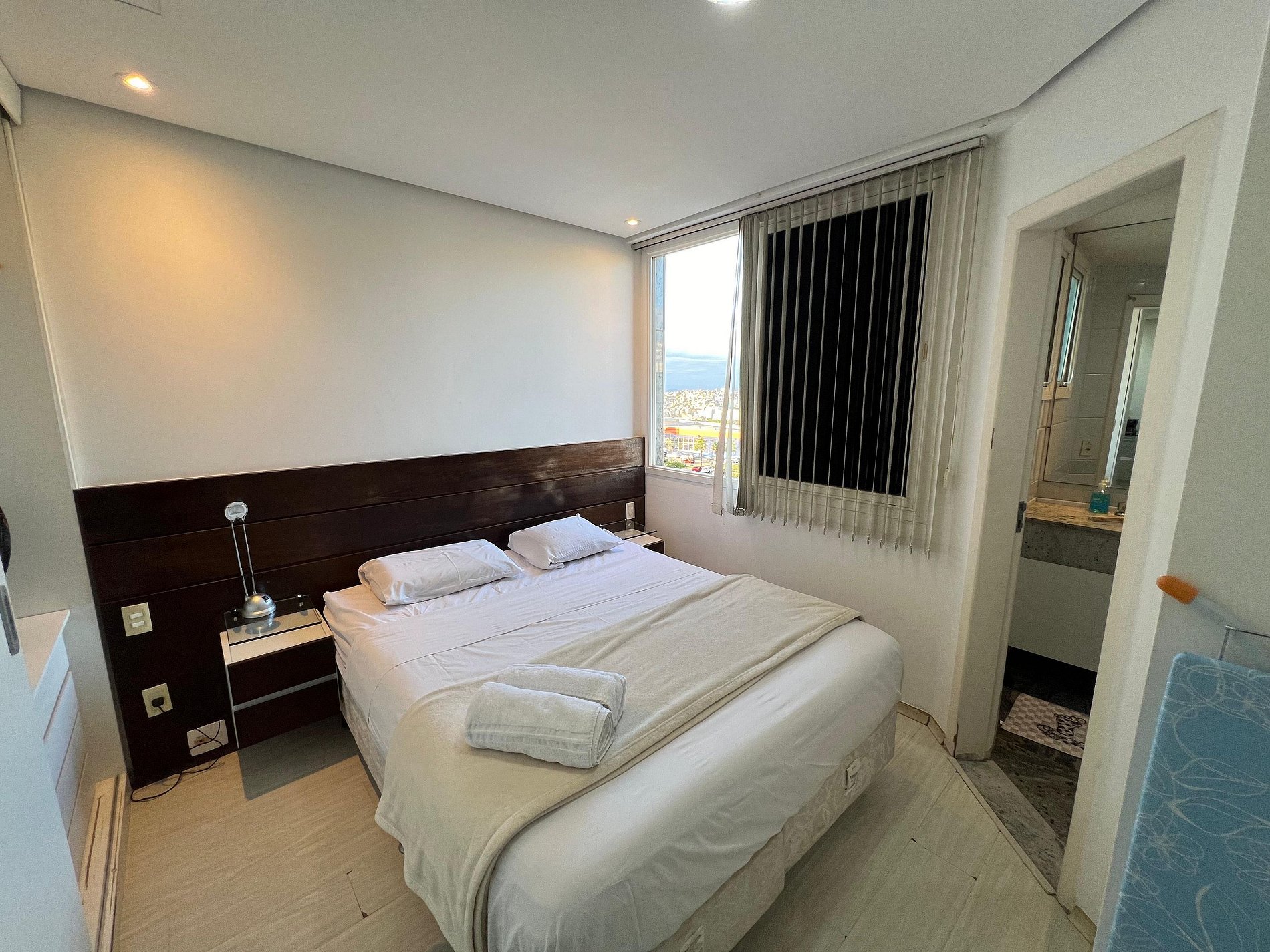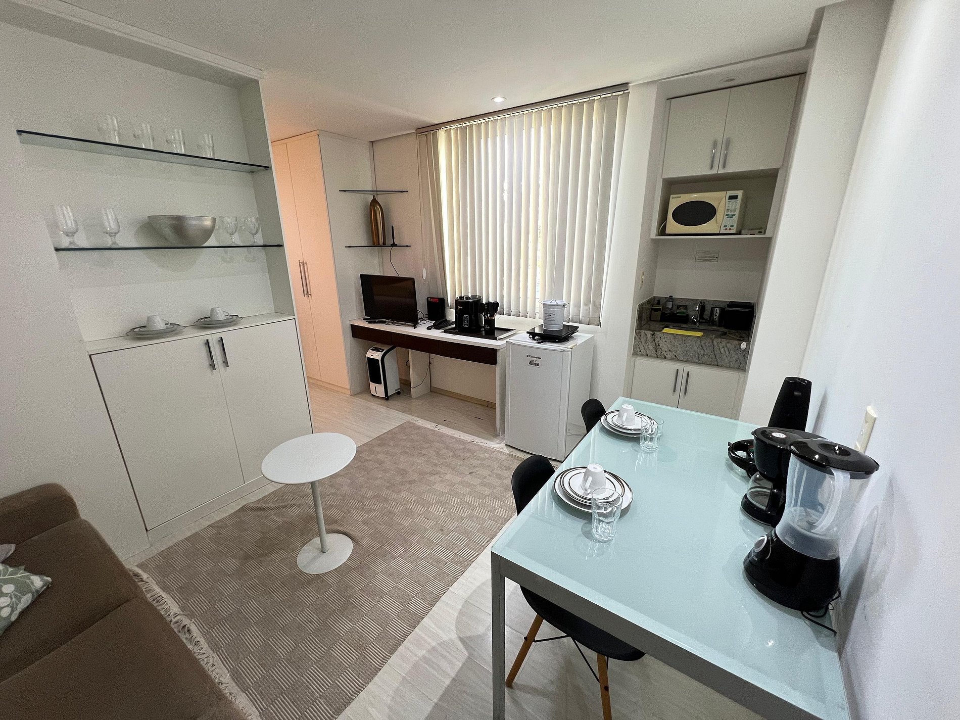 A suíte possui uma cama box queen, duas mesas de cabeceira com luminária e armário com cabides. O apartamento oferece travesseiros, roupa de cama e banho, shampoo e sabonete. A sala de estar possui televisão, uma mesa com duas cadeiras, um sofá-cama em tecido para duas pessoas. O outro ambiente é uma cozinha americana com armários, bancada, e está equipada com refrigerador tipo frigobar, forno de Micro-ondas de 20L, cooktop de duas bocas, sanduicheira inox grill, liquidificador, garrafa térmica com base de filtro para café e cafeteira elétrica. A cozinha possui também copos, taças, pratos rasos, pratos fundos, tigelas e talheres e xícaras. Estão disponíveis ferro, tábua de passar e produtos de limpeza.