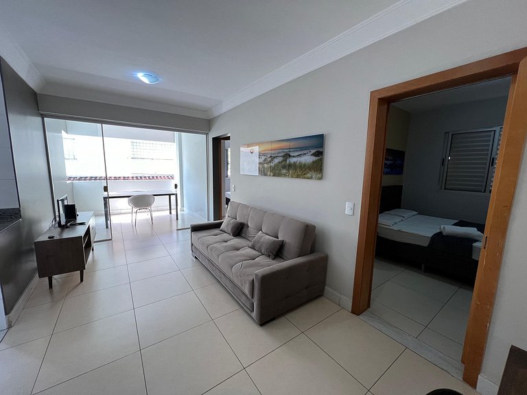 A sala de estar inclui uma estação de trabalho e sofá para duas pessoas. A Smart TV de 24” está conectada ao Wi-Fi, com acesso à Netflix e canais abertos. Na varanda, mesa com quatro cadeiras proporciona um ótimo espaço para refeições ou relaxamento.