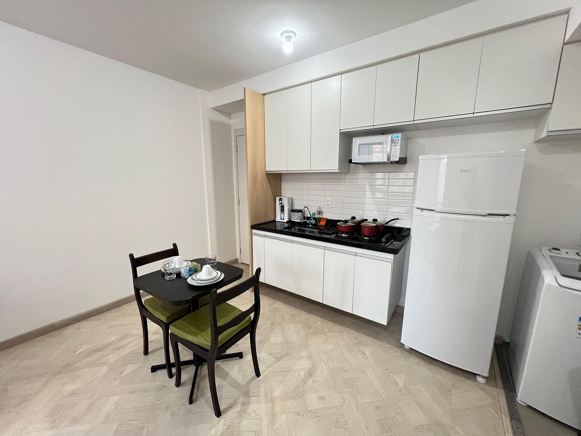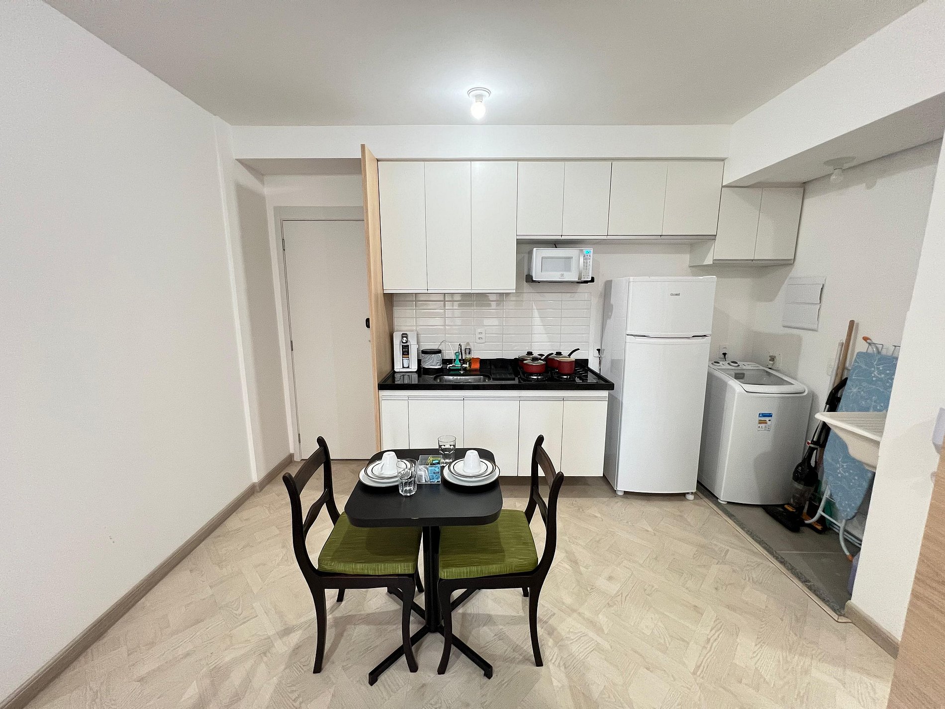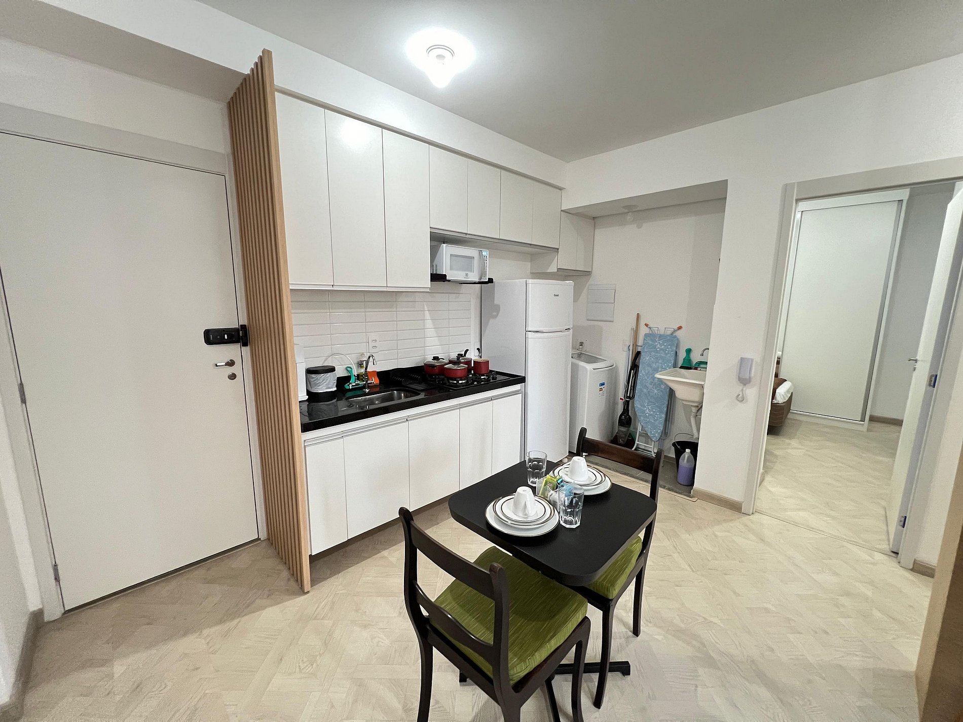 O primeiro quarto possui uma cama de casal, varanda, uma mesa de cabeceira e armário espelhado. O segundo quarto conta com duas camas de solteiro e armários amplos. O apartamento oferece travesseiros, roupa de cama e banho, shampoo e sabonete. A sala de estar possui 02 ambientes, sendo um ambiente com uma uma mesa com quatro cadeiras para refeição e trabalho e um sofá com televisão 43". O outro ambiente é uma cozinha americana , e está equipada com refrigerador, cooktop 4 bocas, micro-ondas de 20L, sanduicheira inox grill, liquidificador, garrafa térmica com base de filtro para café e cafeteira elétrica . Máquina de lavar e produtos de limpeza à disposição. A cozinha possui também copos, taças, pratos rasos, pratos fundos, tigelas e talheres e xícaras para quatro pessoas. Estão disponíveis ferro e tábua de passar.