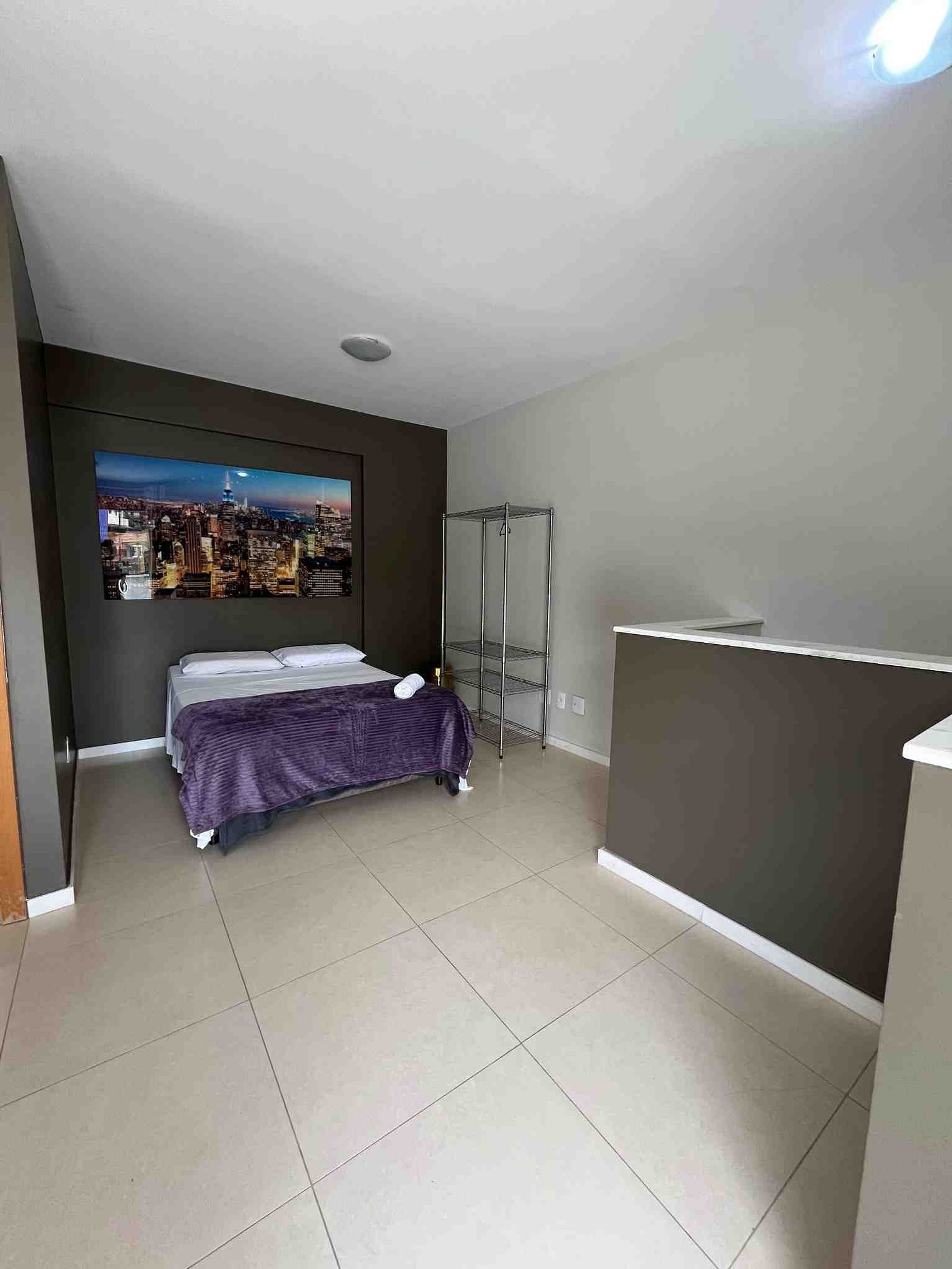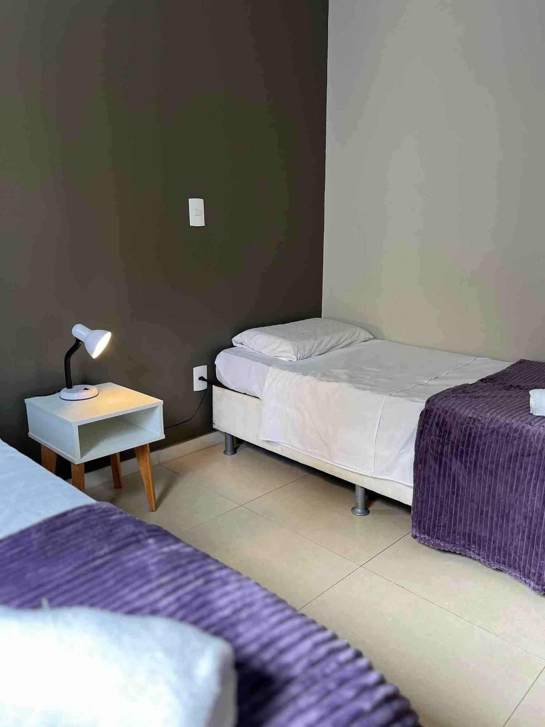 A suíte possui uma cama box de casal padrão, uma mesa de cabeceira e armário com cabides. O outro quarto possui duas camas de solteiro, mesa de cabeceira e armários. Os quartos e banheiros possuem travesseiros, roupa de cama e banho. A sala de estar possui um ambiente com uma estação de trabalho, o outro ambiente conta com um sofá para duas pessoas, uma smart TV 32” já conectada ao Wi-Fi do apartamento. A mesa de jantar com quatro cadeiras esta integrada com a bancada da cozinha. A cozinha, com armários, está equipada com Refrigerador, forno de Micro-ondas , fogão de quatro bocas com acendimento automático, sanduicheira inox grill, liquidificador, garrafa térmica com base de filtro para café e filtro de água. A área de serviço possui um tanque de 20 litros, lavadora de roupas 8 kg turbo, tábua e ferro de passar, varal de chão, cesto para roupa suja, balde, vassoura, rodo e pá, além de produtos básicos de limpeza. No segundo nível da cobertura uma sala foi adaptada para funcionar como o terceiro quarto com uma cama de casal. Disponibilizamos colchões de solteiro avulso.