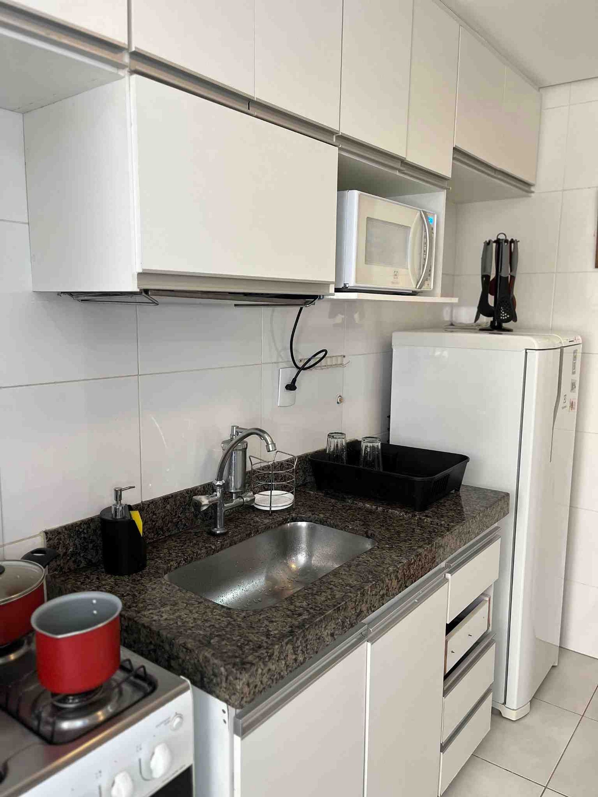 A suíte possui uma cama box de casal padrão, uma mesa de cabeceira e armário com cabides. O outro quarto possui duas camas de solteiro, mesa de cabeceira e armários. Os quartos e banheiros possuem travesseiros, roupa de cama e banho. A sala de estar possui um ambiente com uma estação de trabalho, o outro ambiente conta com um sofá para duas pessoas, uma smart TV 32” já conectada ao Wi-Fi do apartamento. A mesa de jantar com quatro cadeiras esta integrada com a bancada da cozinha. A cozinha, com armários, está equipada com Refrigerador, forno de Micro-ondas , fogão de quatro bocas com acendimento automático, sanduicheira inox grill, liquidificador, garrafa térmica com base de filtro para café e filtro de água. A área de serviço possui um tanque de 20 litros, lavadora de roupas 8 kg turbo, tábua e ferro de passar, varal de chão, cesto para roupa suja, balde, vassoura, rodo e pá, além de produtos básicos de limpeza. No segundo nível da cobertura uma sala foi adaptada para funcionar como o terceiro quarto com uma cama de casal. Disponibilizamos colchões de solteiro avulso.